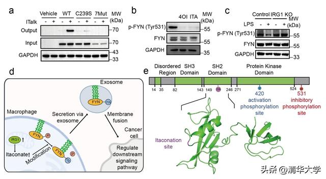 尤为引人注目的是,研究团队发现酪氨酸激酶FYN在Cys239位点发生衣康酸修饰,该修饰通过抑制其Tyr531位点的磷酸化,显著增强FYN激酶活性(图2)。在IRG1敲除细胞中,LPS无法抑制FYN磷酸化,证明该调控依赖于内源性衣康酸。此外,FYN被发现存在于巨噬细胞来源的外泌体中,提示其可能通过外泌体介导的跨细胞信号传递,在肿瘤微环境等病理条件下调控受体细胞的信号通路。