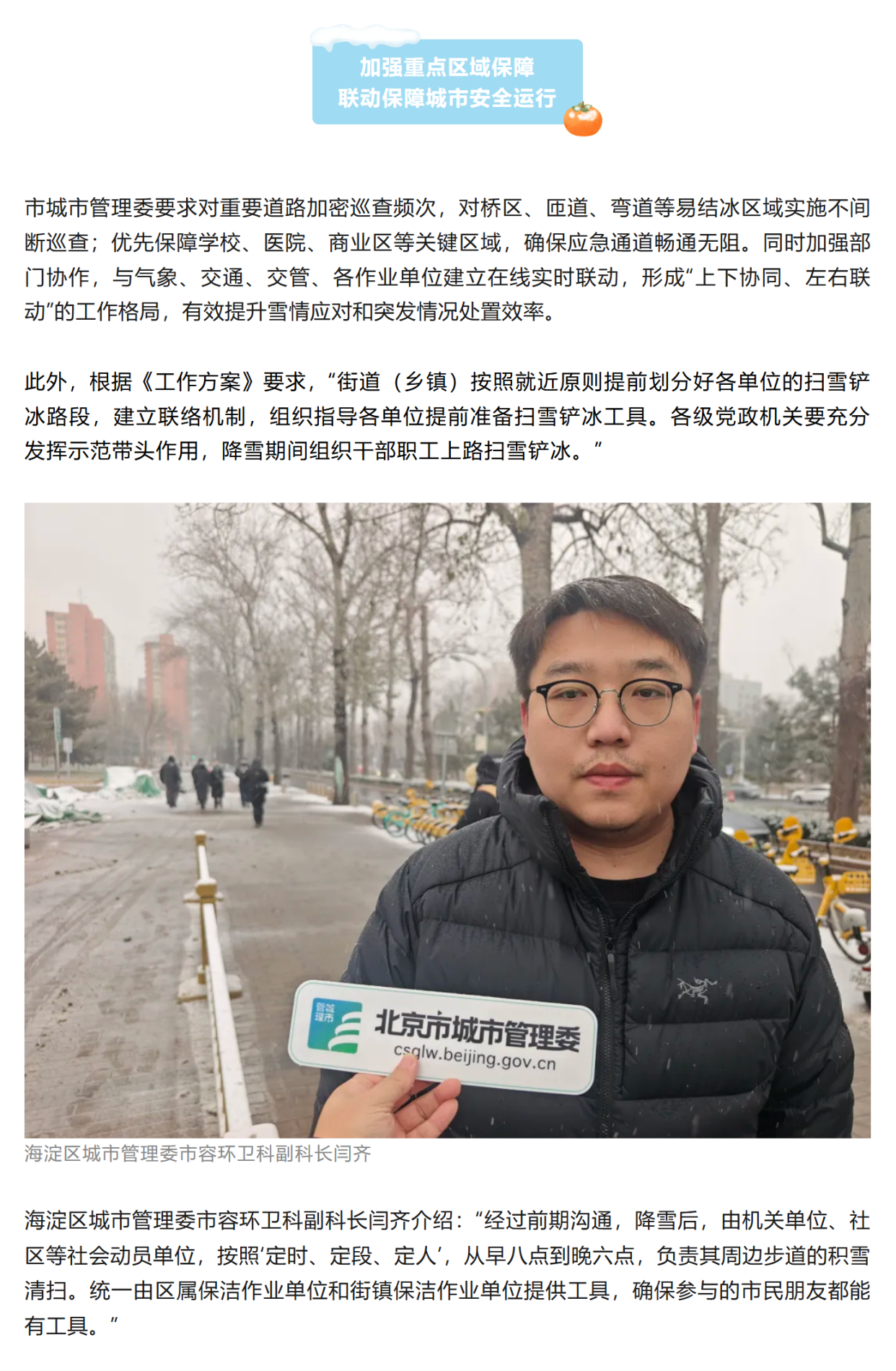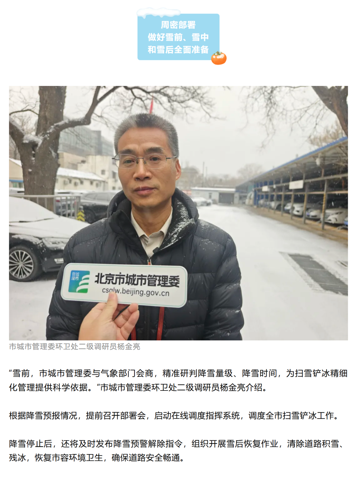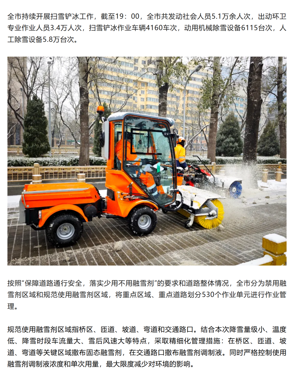 为应对今年入冬以来首场降雪,市城市管理委提前部署全市扫雪铲冰工作,全力保障城市平稳运行与市民出行安全。
