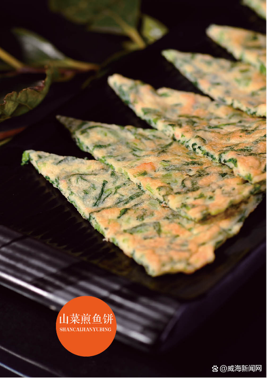 4.将平锅置旺火上烧热,倒入适量花生油,烧至7成热,放入荠菜糊,摊制成荠菜圆饼,转用小火,煎至两面呈浅黄色成熟后,将荠菜饼放在熟砧板上,切成三角块,摆入盘内即可。