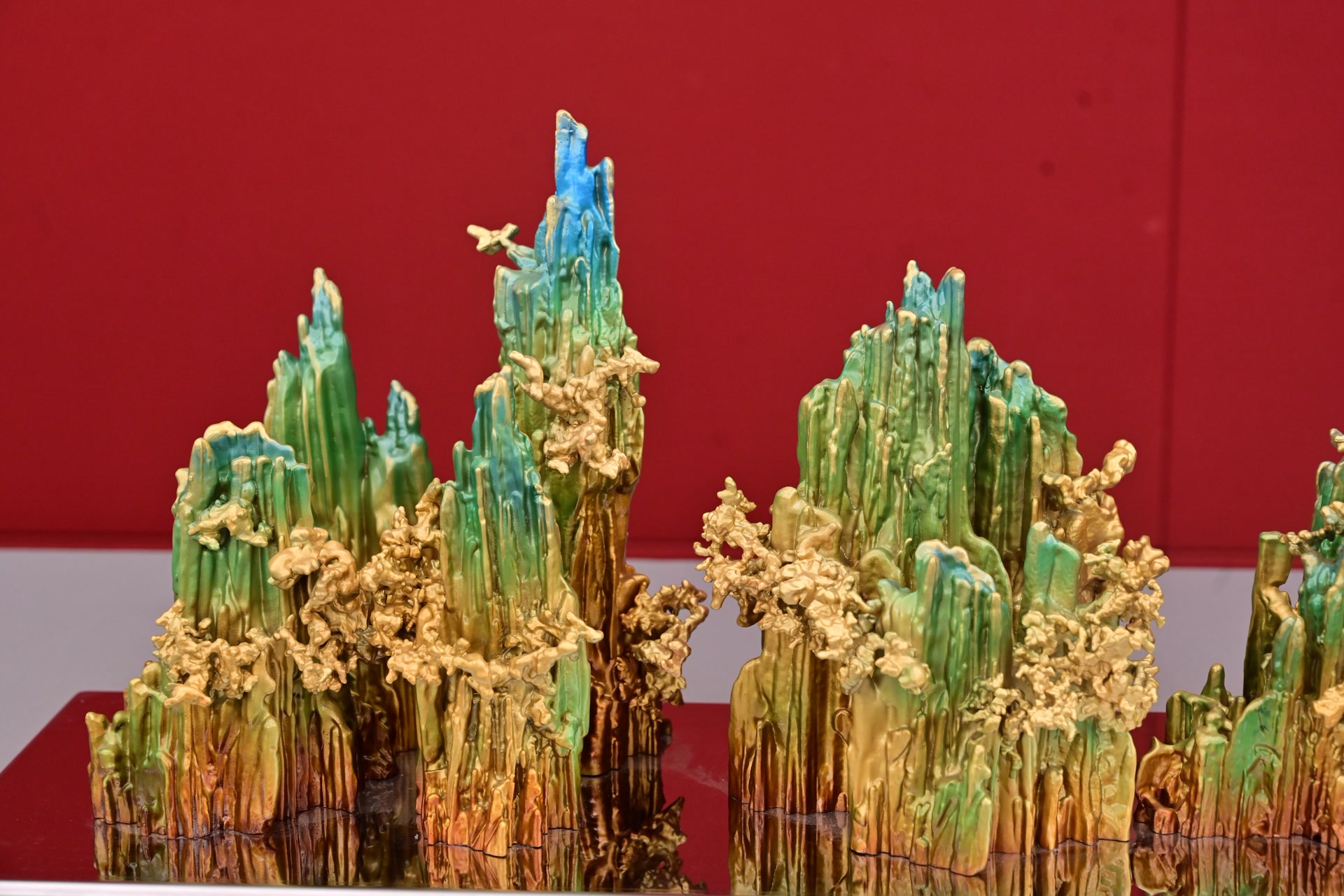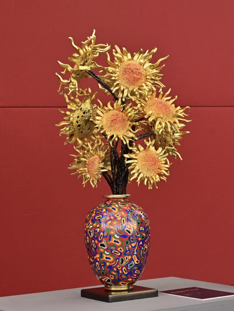 此次国博收藏了朱炳仁艺术作品9组(共10件)和朱军岷艺术作品4件。其中,朱炳仁的《千浪卷雪》《万里长城》《千里江山》等作品立意高远,气势磅礴,彰显中华美学的雄浑气魄;《国鹿》《青花铜瓶》分别以独特的“动感”塑造和精妙的色彩搭配,为传统形象注入创新意义;《燃烧的向日葵》巧妙运用熔铜技艺塑造向日葵的蓬勃生命力,不仅体现中华美学意蕴,而且富有现代气息,形成与西方艺术的对话,堪称中国工艺美术当代创新的典型代表。朱军岷的《连年如意》《繁花似锦》《蕉石鹤寿》《万全如意》以中国古代传统吉祥题材展开创作,在材质、造型、颜色处理方面匠心独运,多有突破和创新。