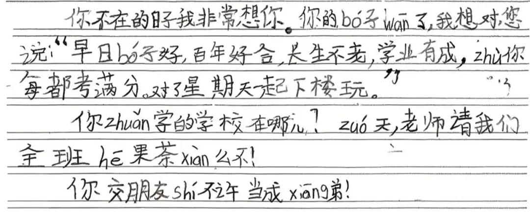 小朋友们写的信都不长,有不会写的字就用拼音代替,有些词语的含义他们虽然不明白,但也写在信里表达祝福。很多网友看完了这些信后被感动并表示:“这一刻,我好似明白了纸短情长的真正含义。”