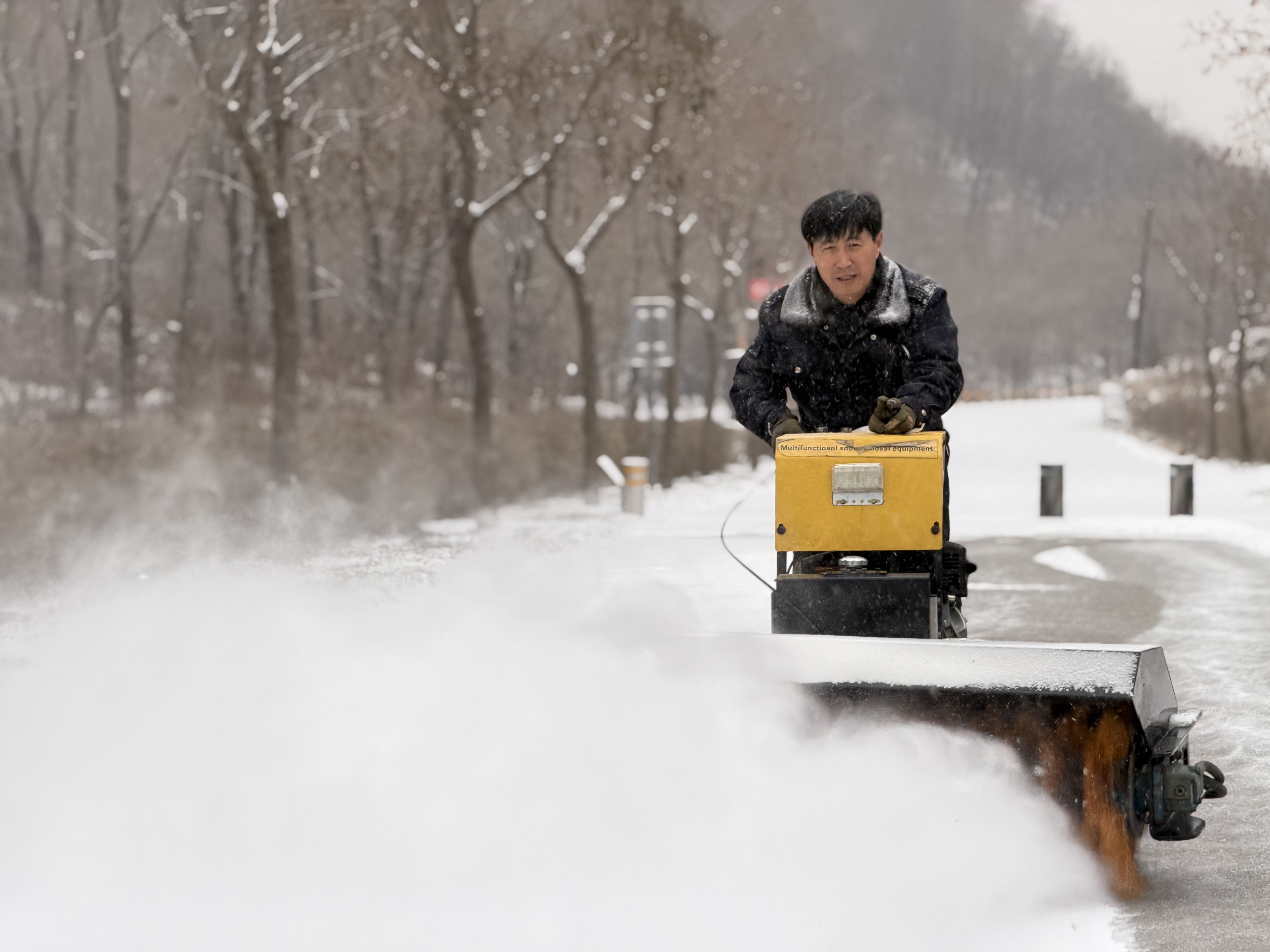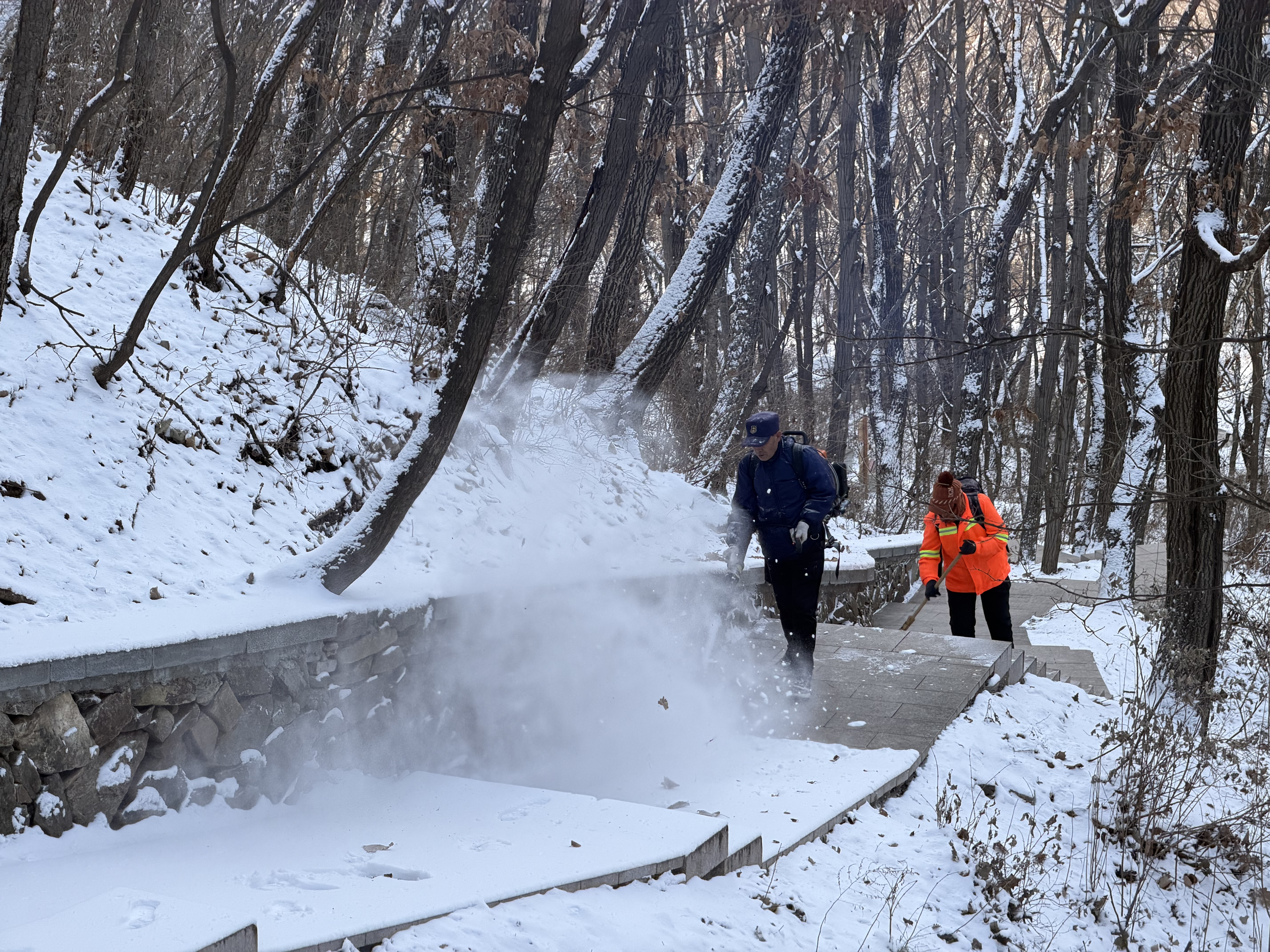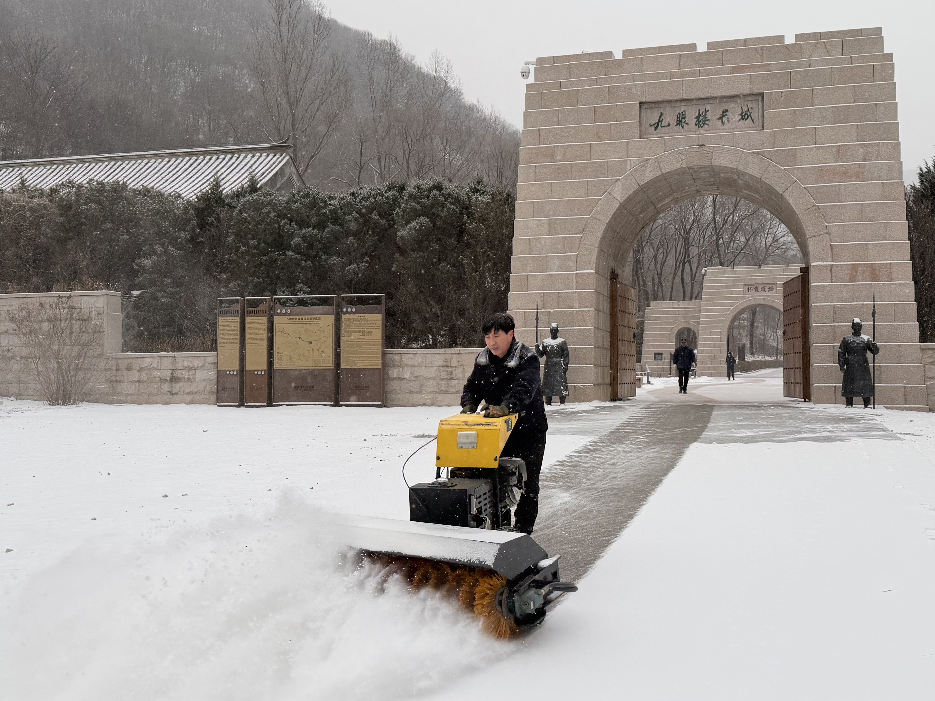 为保障游客游览安全,早8点,景区16名工作人员全员出动,用3台吹雪机、1台小型扫雪车以及雪铲、铁锹等设备,开始扫雪。截至下午两点半,景区步道、长城上的积雪,已全部清理干净,保障游客安全游览。