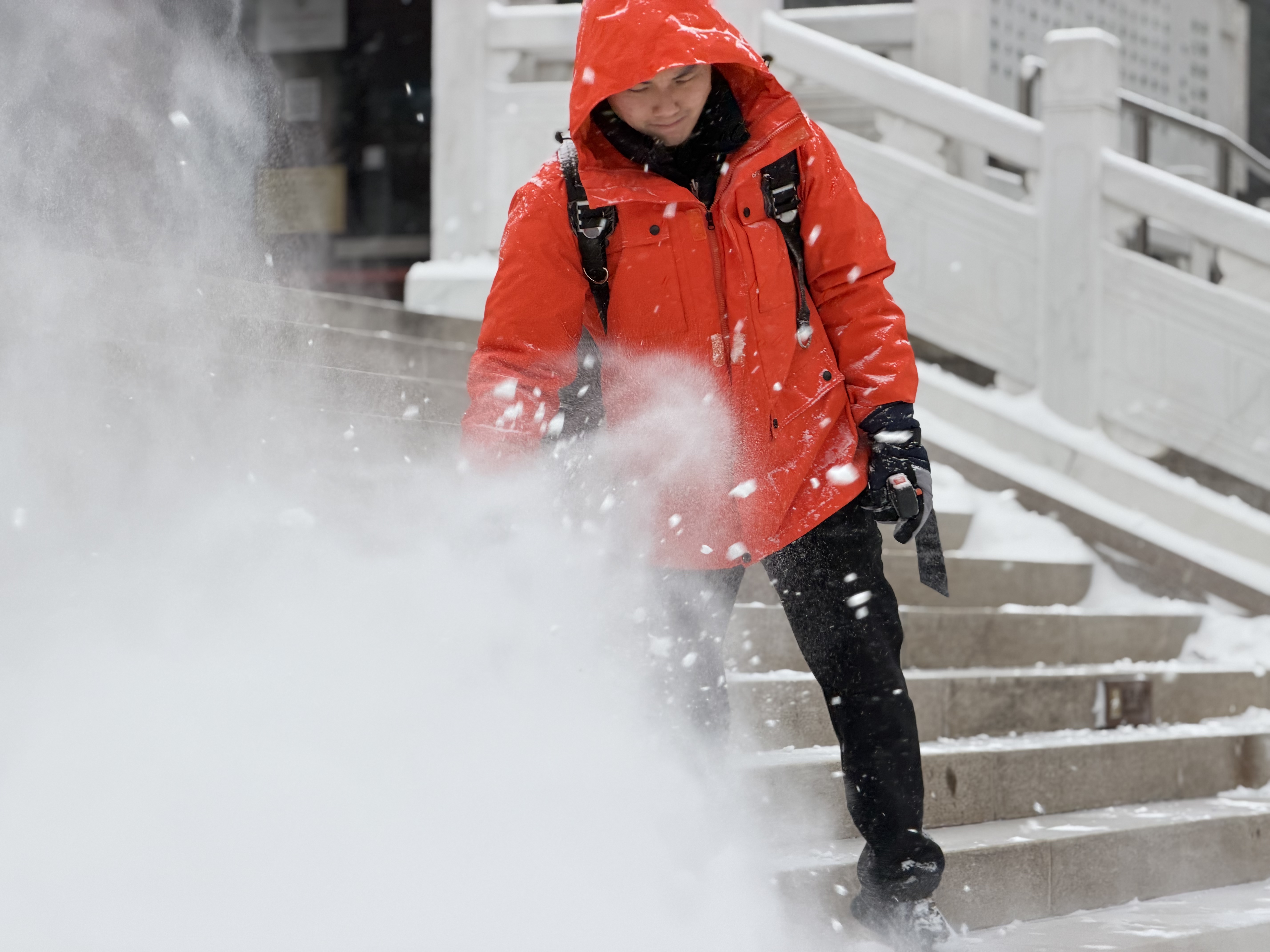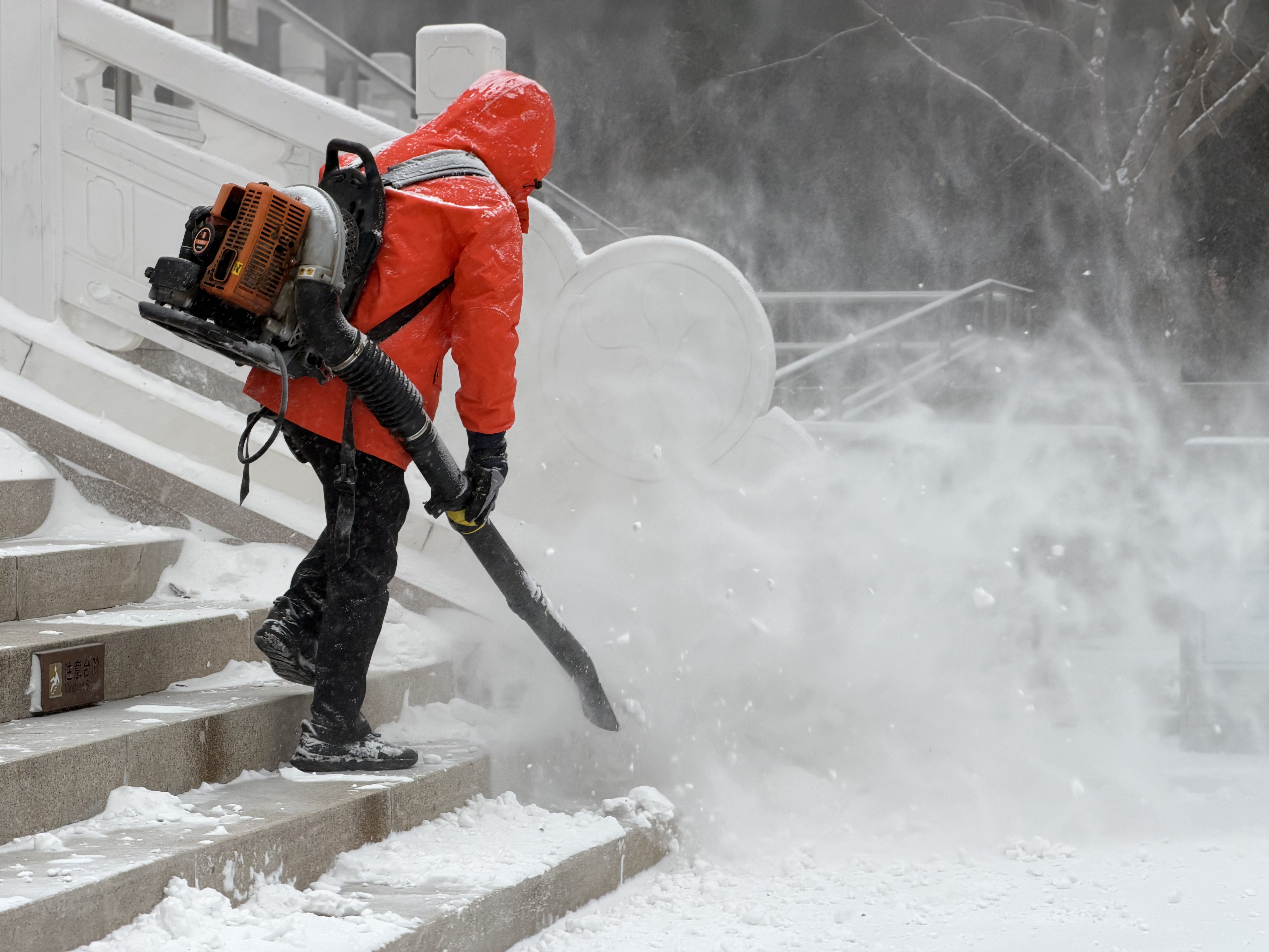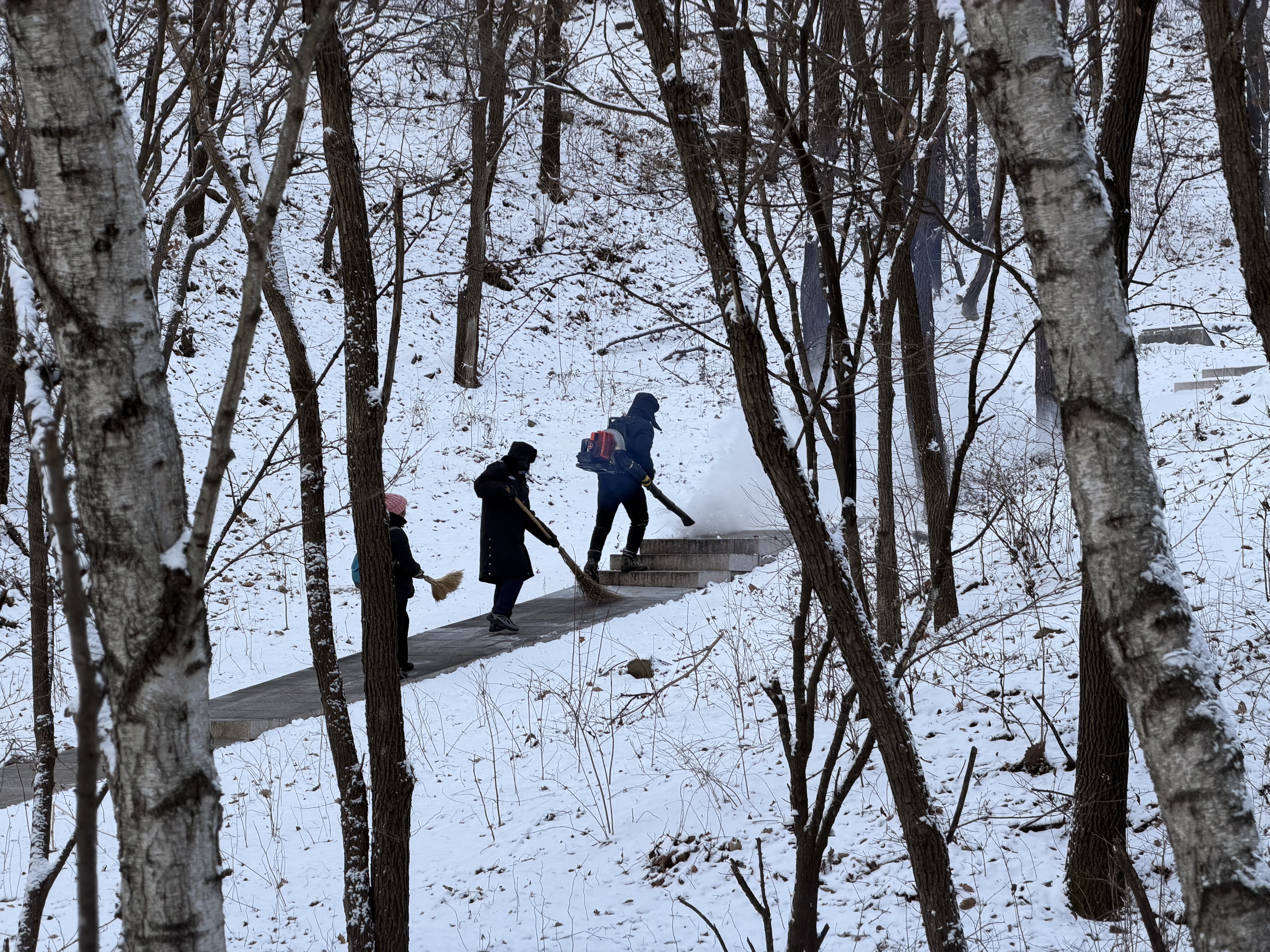 为保障游客游览安全,早8点,景区16名工作人员全员出动,用3台吹雪机、1台小型扫雪车以及雪铲、铁锹等设备,开始扫雪。截至下午两点半,景区步道、长城上的积雪,已全部清理干净,保障游客安全游览。