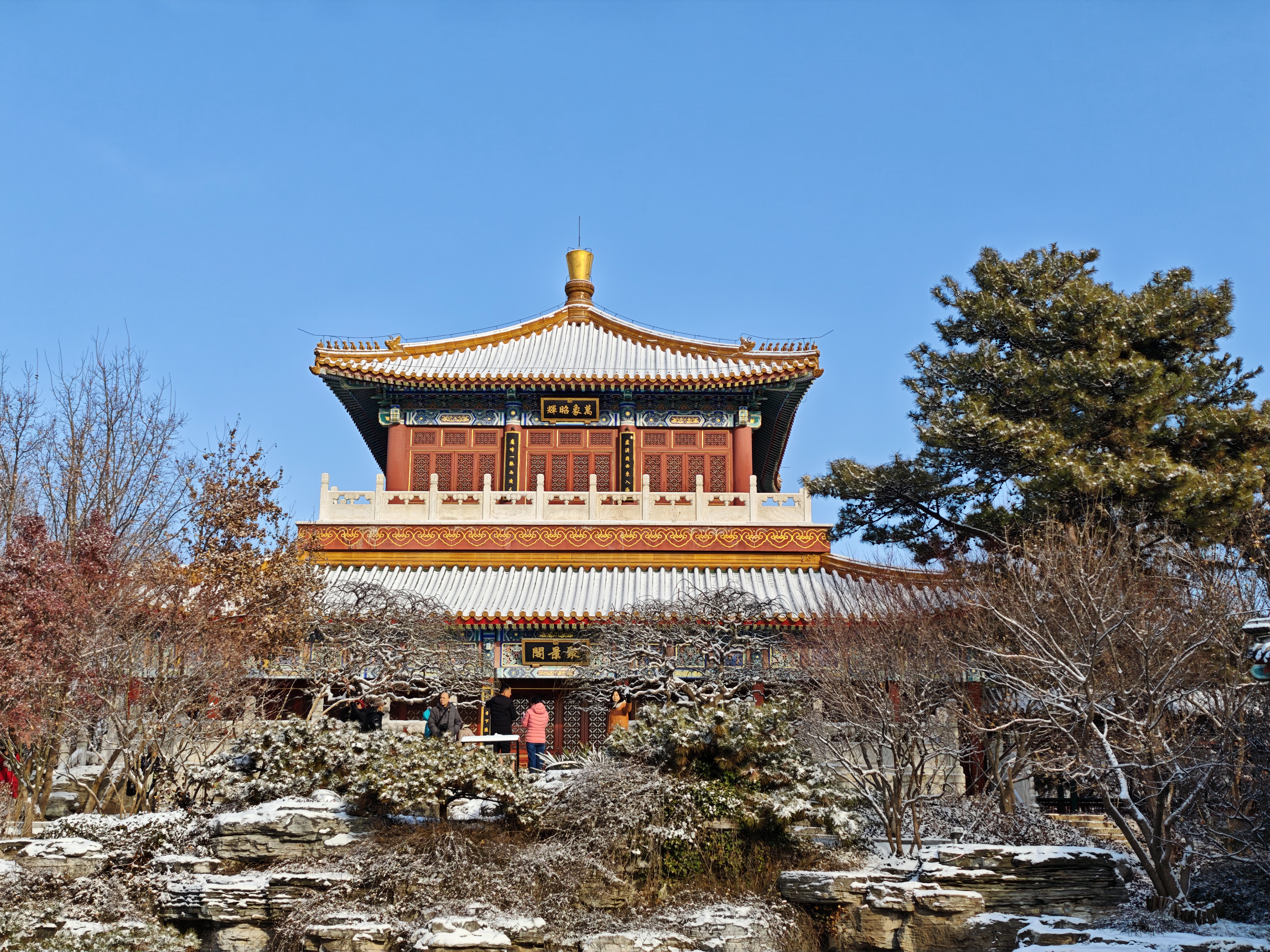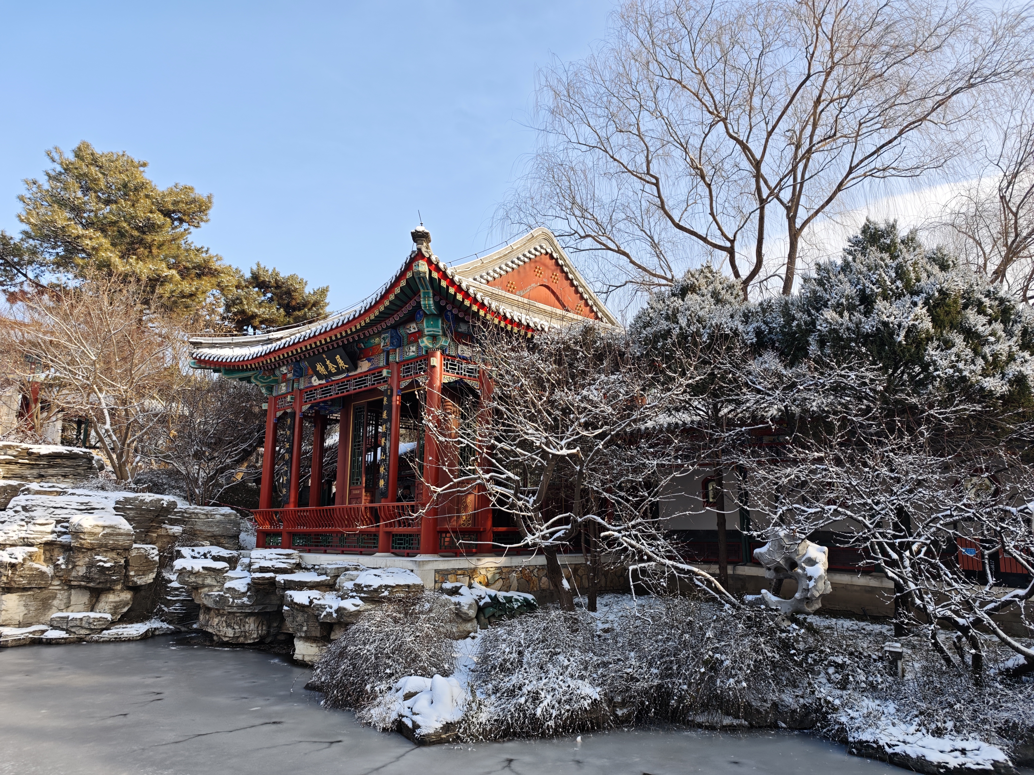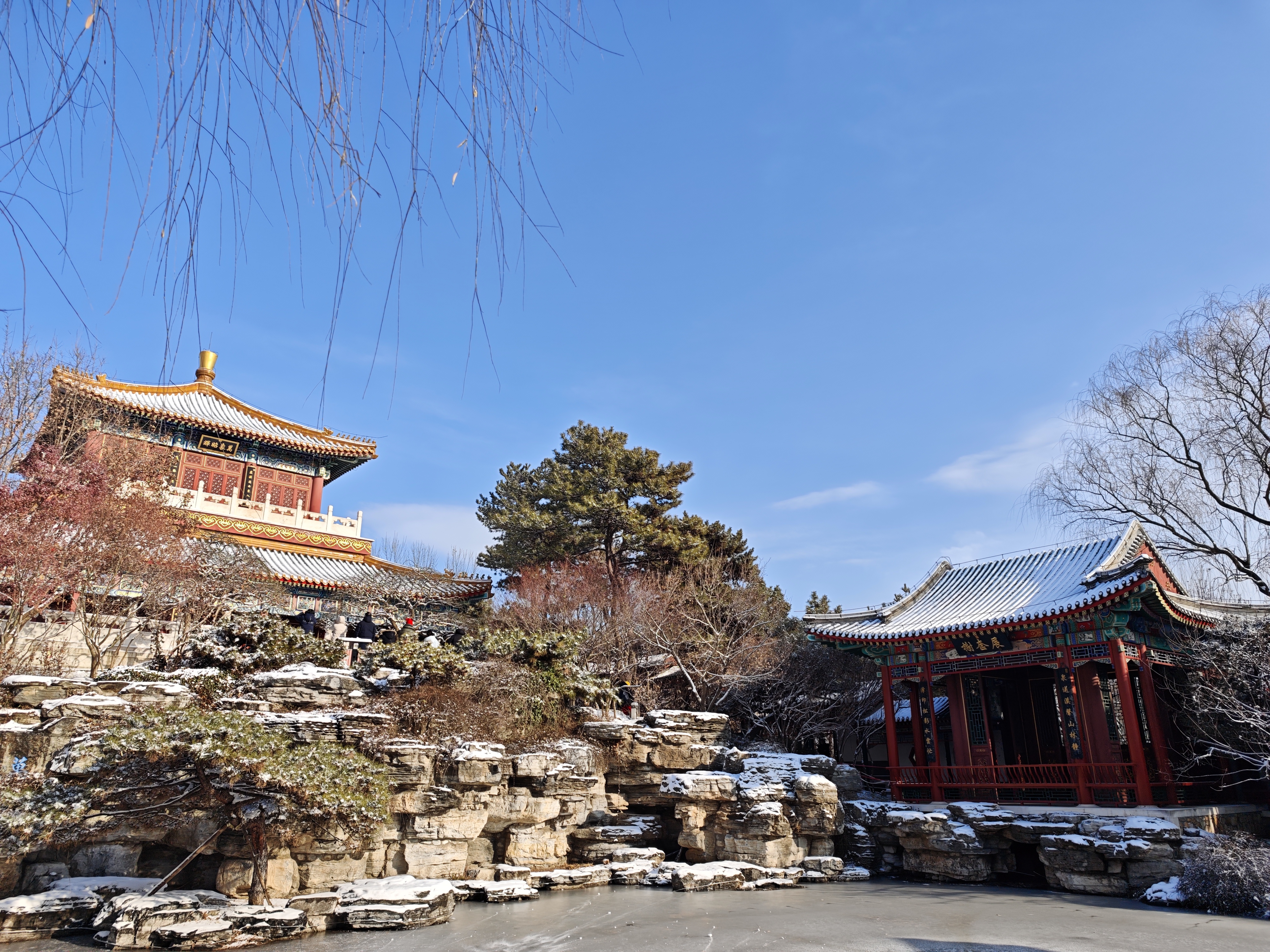从4号门步入园区,不远便是备受游客青睐的北京园。湛蓝晴空下,聚景阁前聚集了不少拍照的市民。朱红的立柱、金色的饰件、斑斓的彩绘,与纯净白雪构成鲜明而和谐的视觉交响,为庄严的仿古建筑增添了几分生动意趣。阳光穿过疏枝,在覆雪的石阶上投下斑驳光影。“这景色,随手一拍都是古风大片。”正专注调整相机角度的王先生笑着说道。