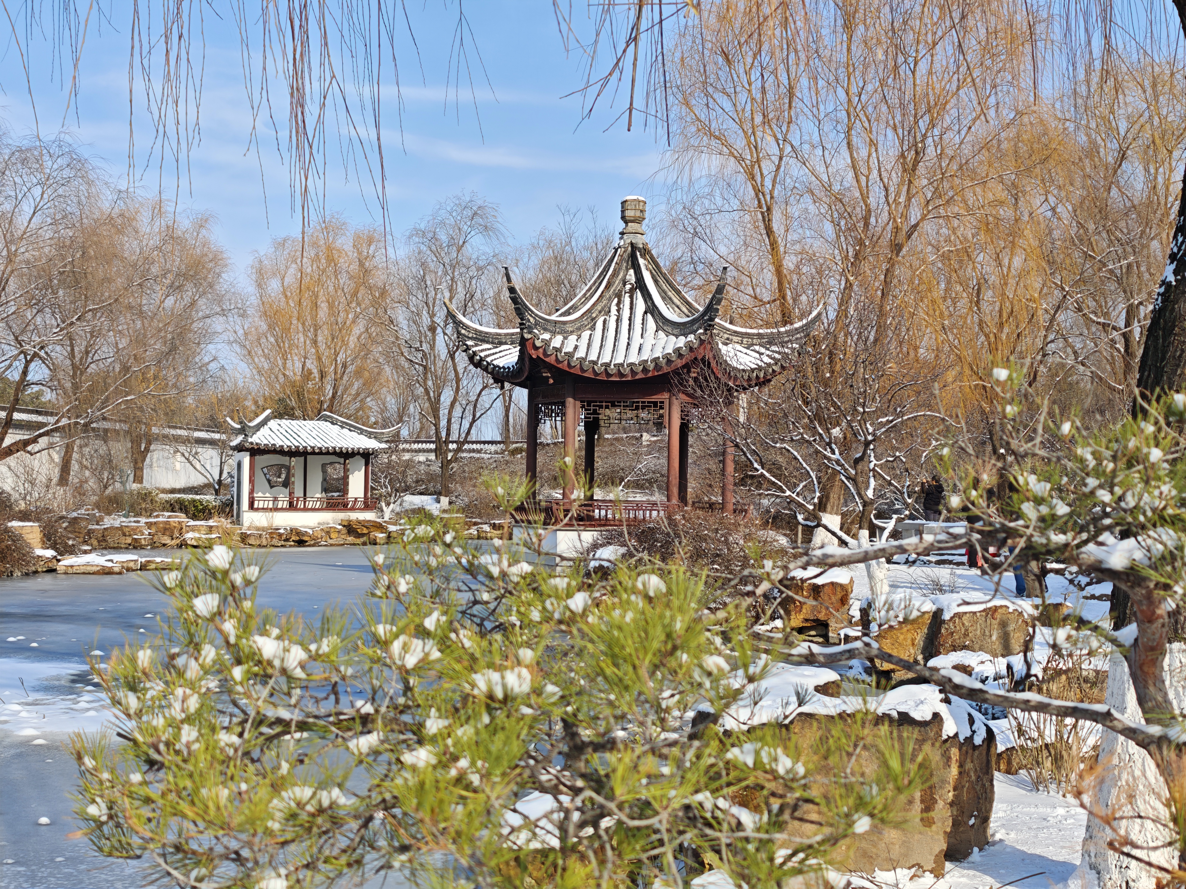 脚踩在松软的积雪上,发出“咯吱咯吱”的清脆声响,与远处空地上孩童们堆雪人、打雪仗的欢快笑声遥相呼应,反而更衬出园区的静谧祥和。沿主路向5号门方向漫步,便来到忆江南园。这里的白墙黛瓦被白雪勾勒出温婉轮廓,亭台与北京园的皇家气韵截然不同,自成一片婉约天地。不时有身着汉服的游客穿梭其间,驻足留影。