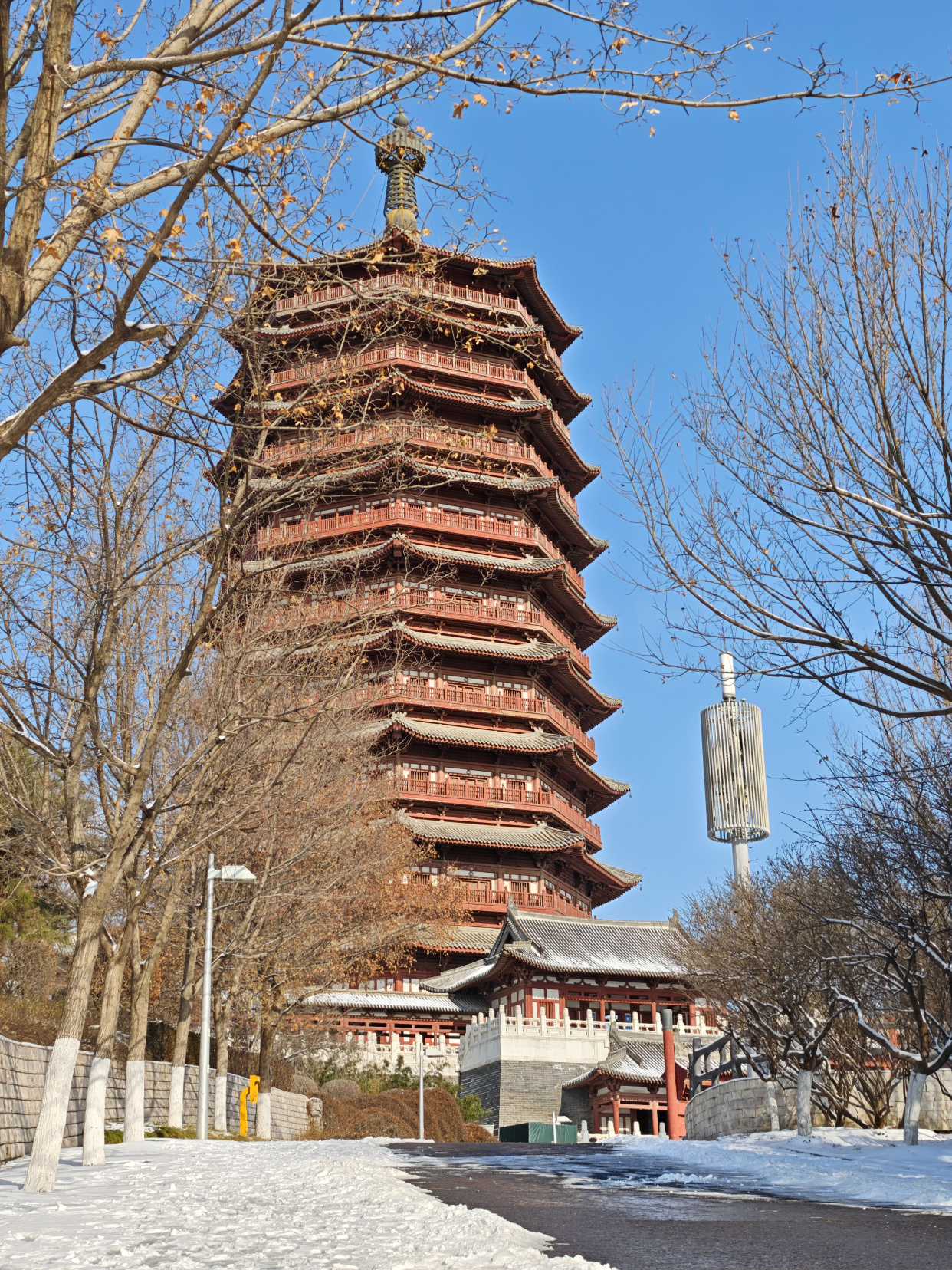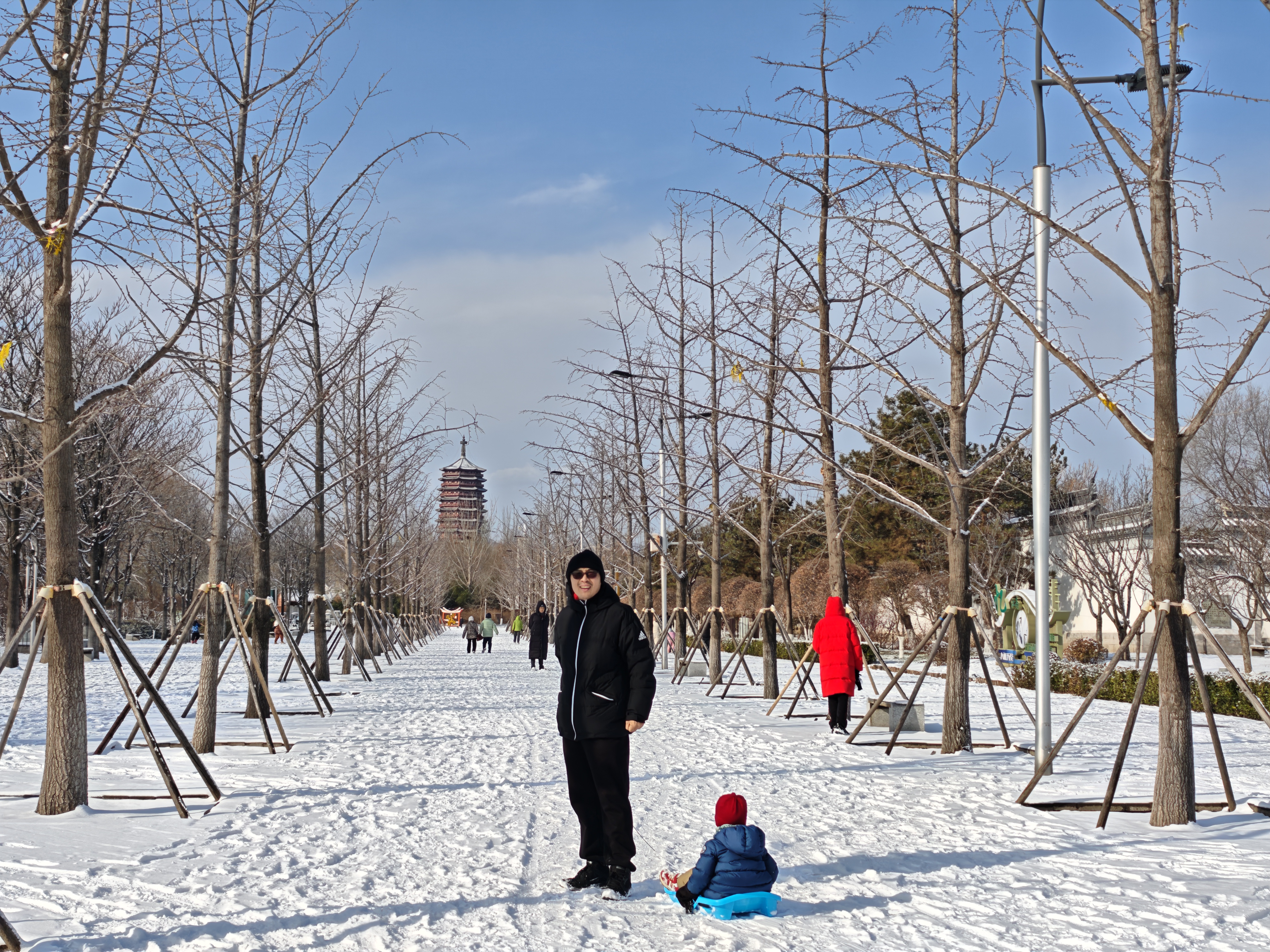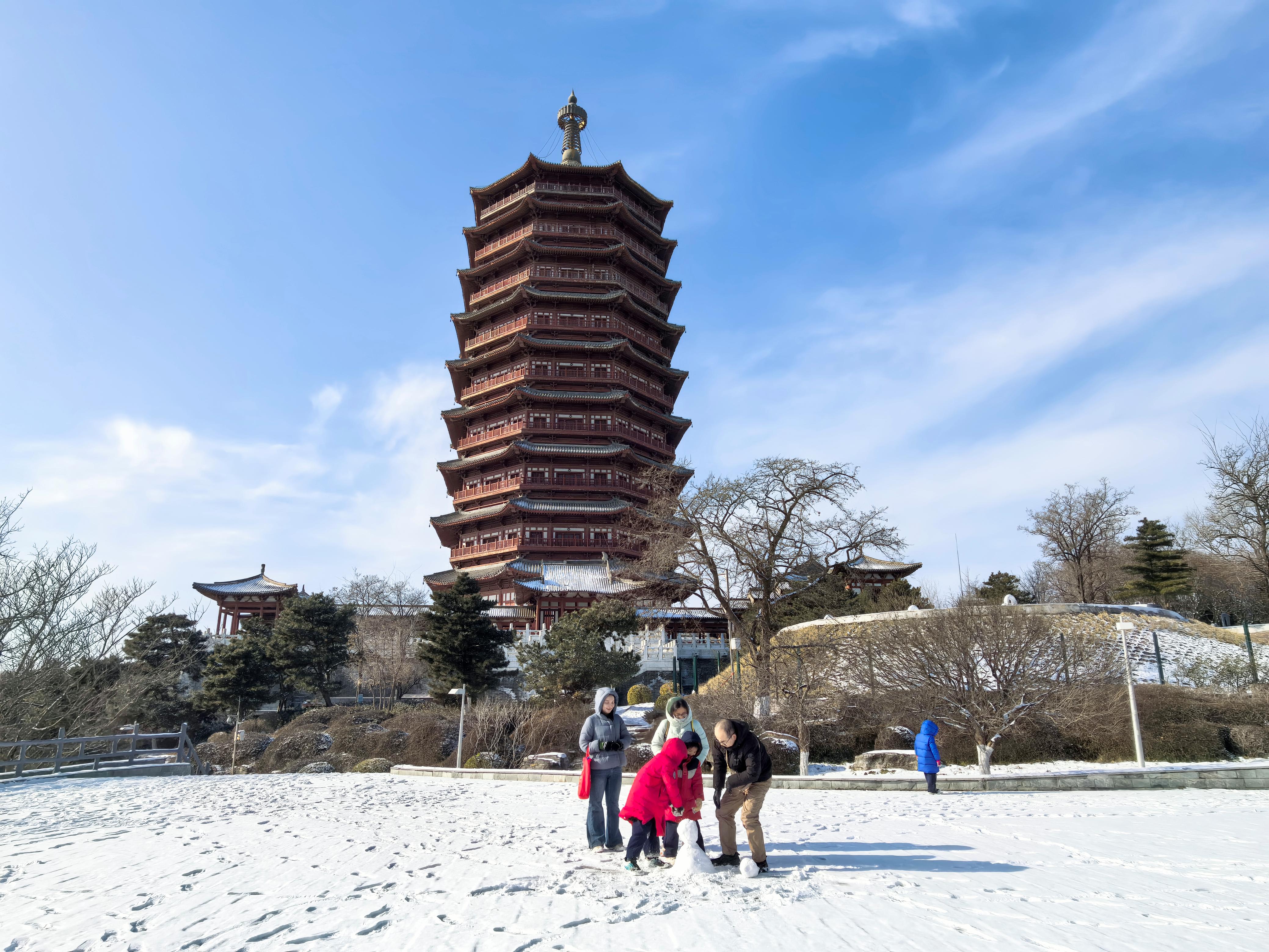 作为北京园博园的标志性建筑,巍峨的永定塔屹立于鹰山之上,在雪后晴空下更显雄伟。塔前广场已成为冰雪乐园,家庭游客们围着亲手堆砌的雪人嬉戏拍照,青年人在雪地上写下祝福字样。雪落无声,园中有韵。这座汇集天下园林精华的“大观园”,正以其包容万象的胸怀和诗意无限的雪景,为市民游客提供着一处远离喧嚣、静心赏玩、体验多元文化的冬日好去处。