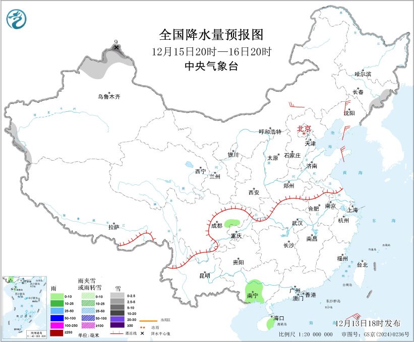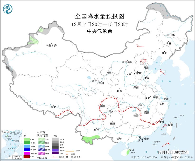 12月14日20时至15日20时,新疆西部、黑龙江西北部等地部分地区有小雪或雨夹雪,其中,新疆南疆西部山区局地有中到大雪(5~9毫米)。云南南部、海南岛东部等地部分地区有小雨。内蒙古东南部、山东半岛等地部分地区有4~6级风;东海北部海域、台湾海峡、南海中东部海域有6~8级大风、阵风9级(见图3)。