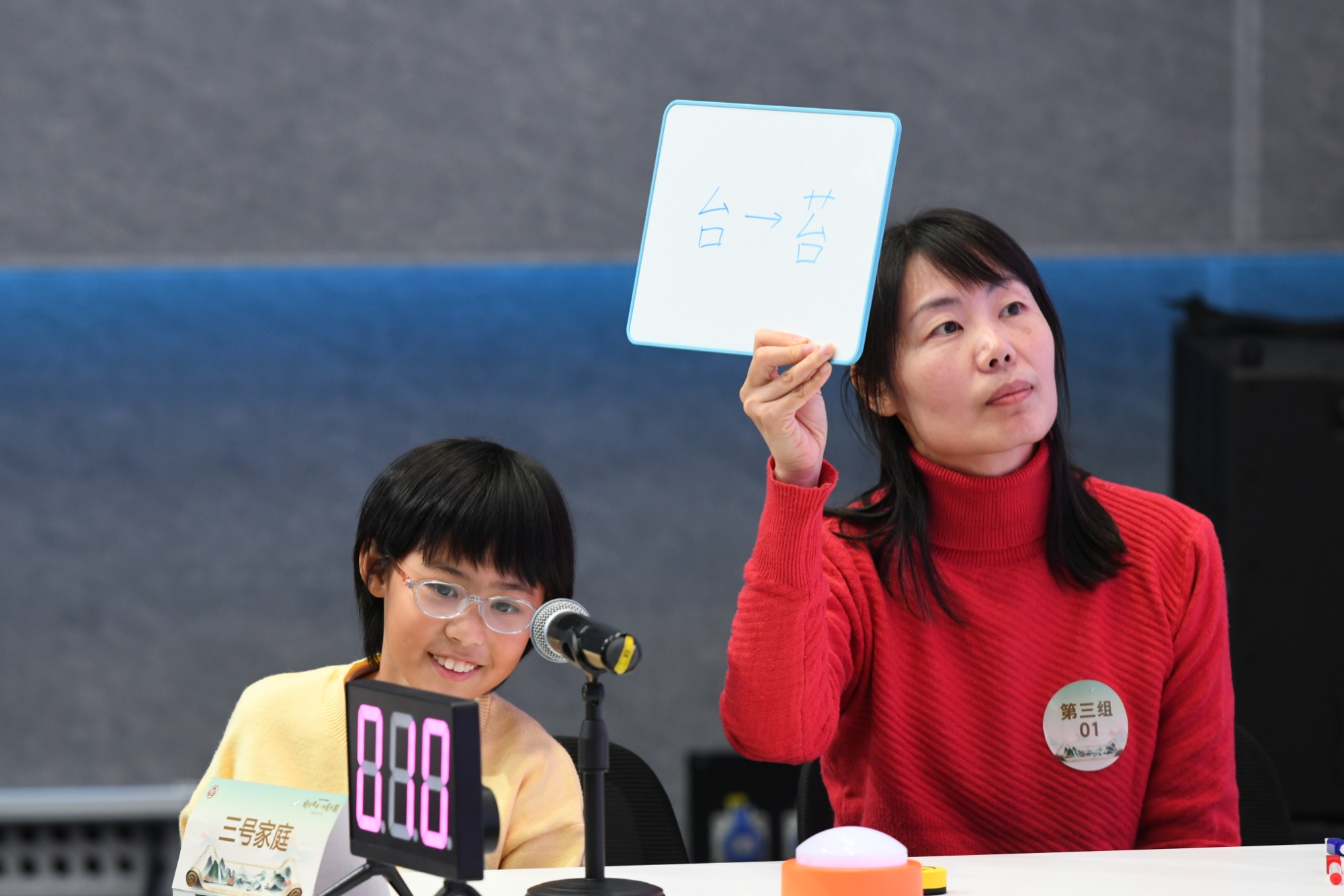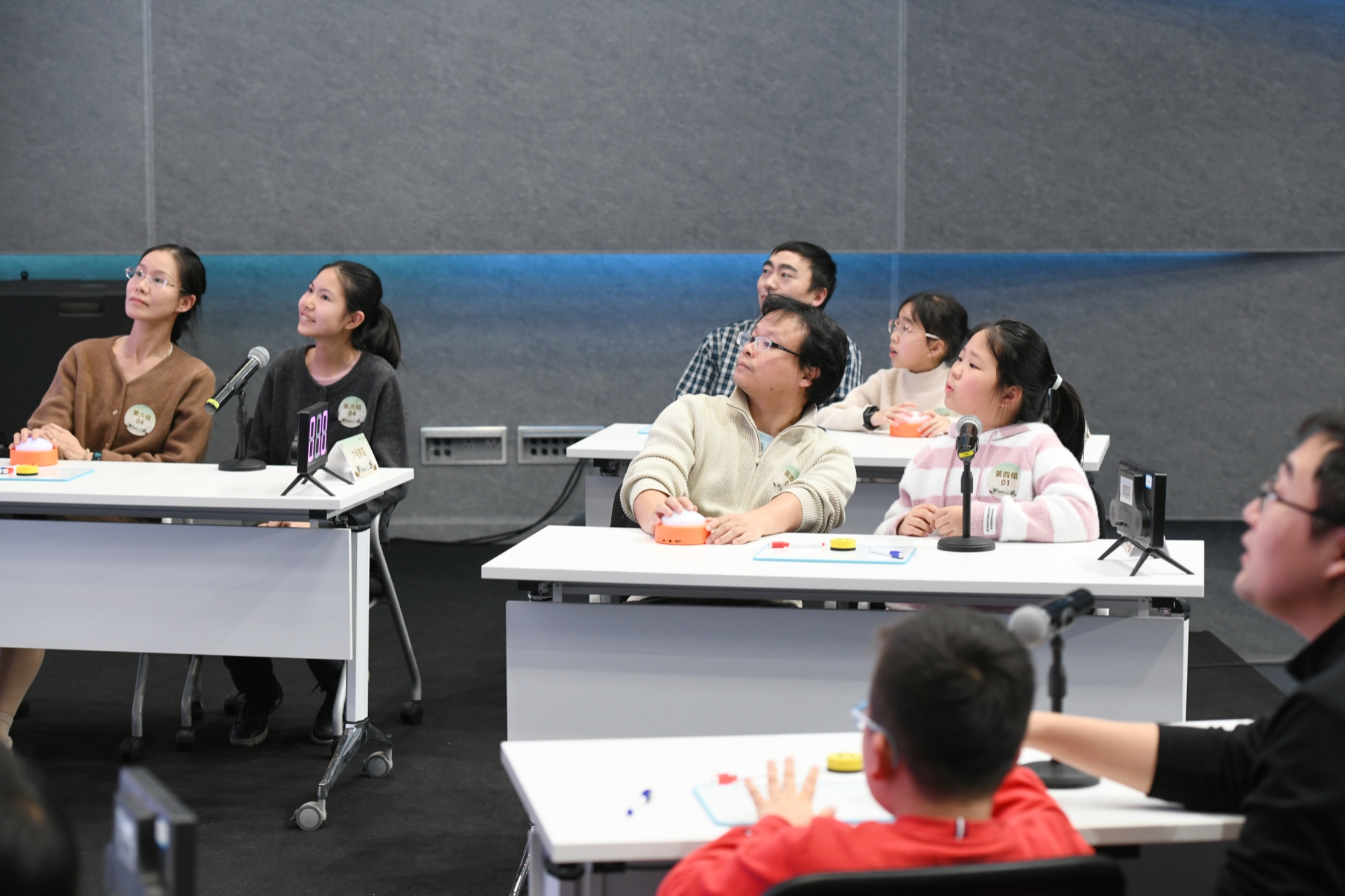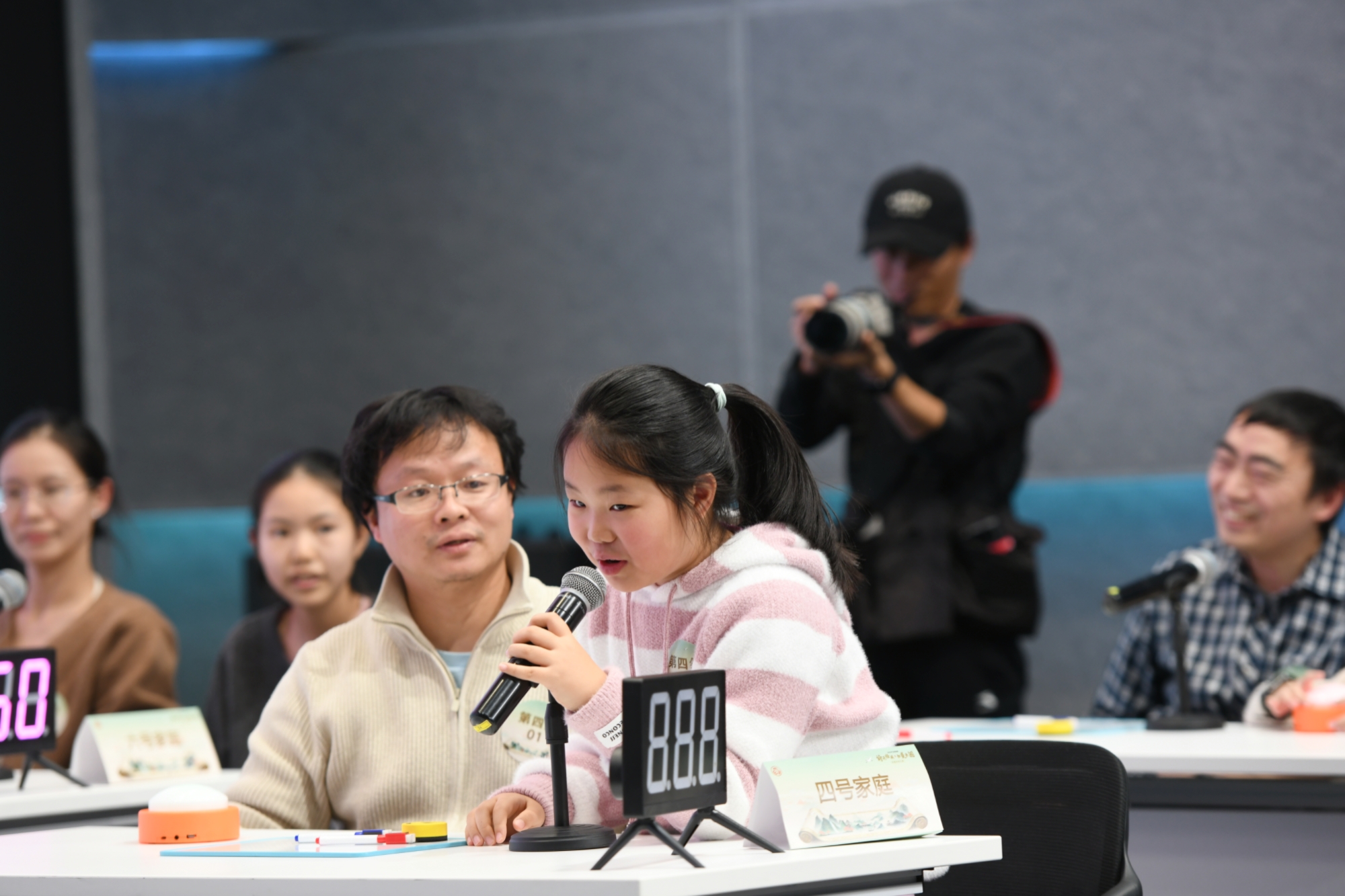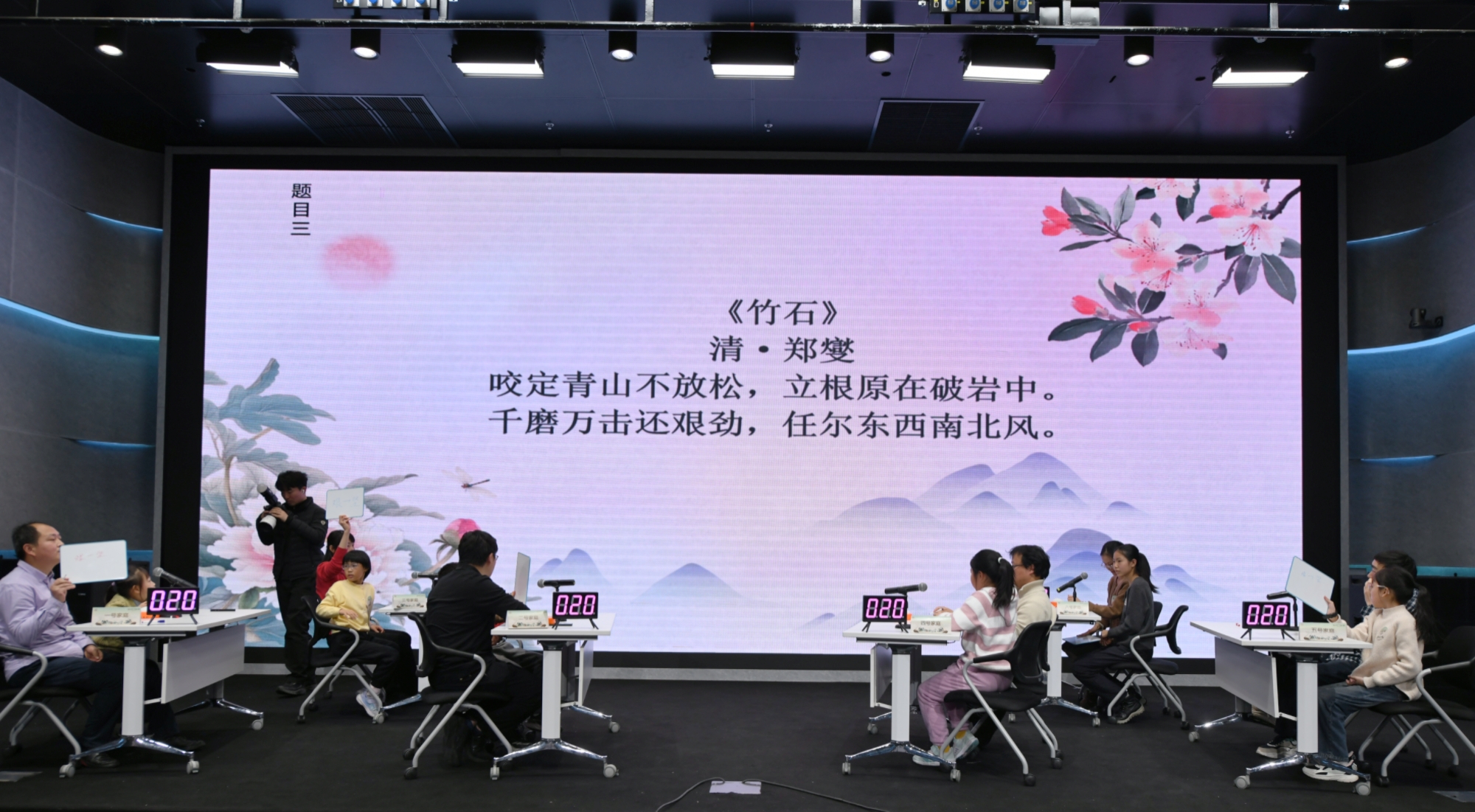 入围半决赛的30组家庭以年龄段分为6组,让不同学龄的小朋友都能在适配的竞技环境中展现风采、收获自信。在“诗词联句”环节,小朋友们用清脆童声一字一句吟诵千古名句;“有问必答”环节,抢答器提示音此起彼伏。紧张赛事间隙,别开生面的互动环节《诗人朋友圈》引发了全场热潮。主持人展示由AI生成的虚拟古代诗人“朋友圈”内容,台下观众踊跃竞猜对应的诗人与诗句,现场气氛热烈,欢声笑语不断。