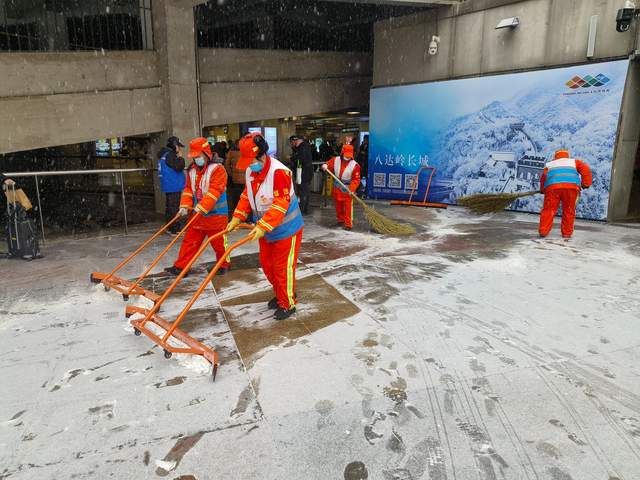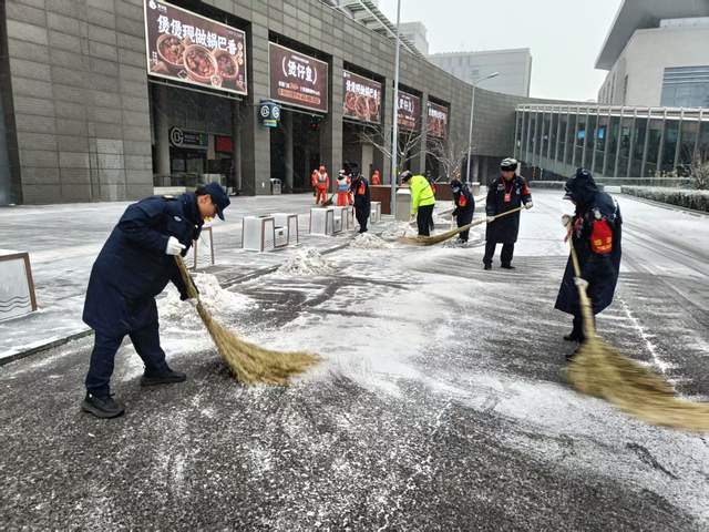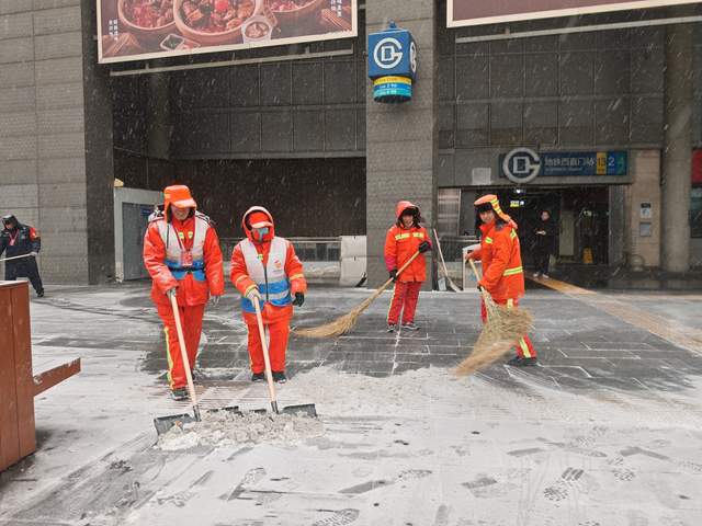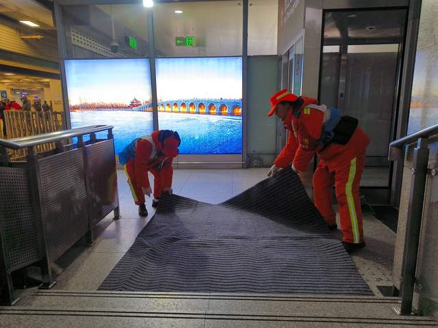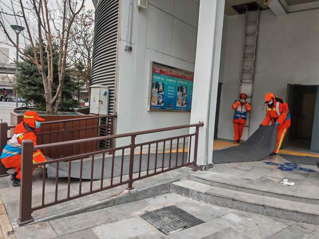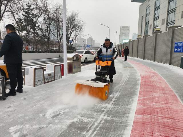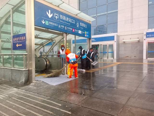 北站办坚持“随降随扫、雪停路净”原则,采取“人机结合”模式开展作业。在站前广场、落客区、人行步道、下沉广场、转河周边等重点区域,工作人员持续清扫,并使用吹雪机清理广场座椅、护栏等城市家具上的积雪。对主要出入口、电梯口、坡道等易滑区域,累计铺设防滑垫、设置“小心地滑”提示牌10余处,并建立每小时巡查反馈机制,实时处理路面积雪与薄冰,保障旅客通行安全顺畅。