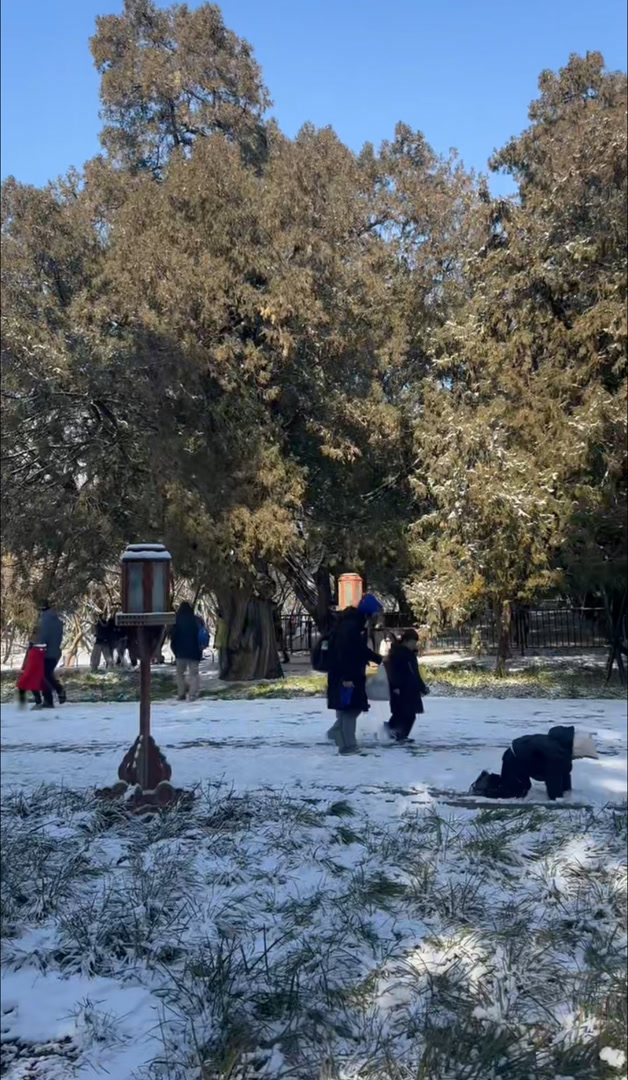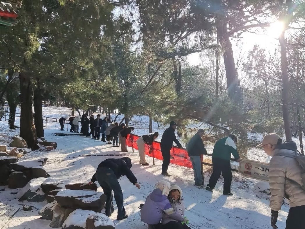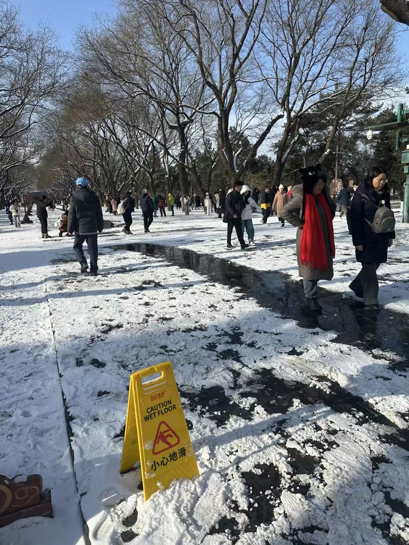 12月13日,整个京城银装素裹,许多市民出门踏雪赏景。记者接连走访了天坛公园、景山公园、颐和园等,发现尽管主干道路的积雪基本清扫完成,但仍有部分路段存在结冰、易滑倒的情况,赏雪需当心。