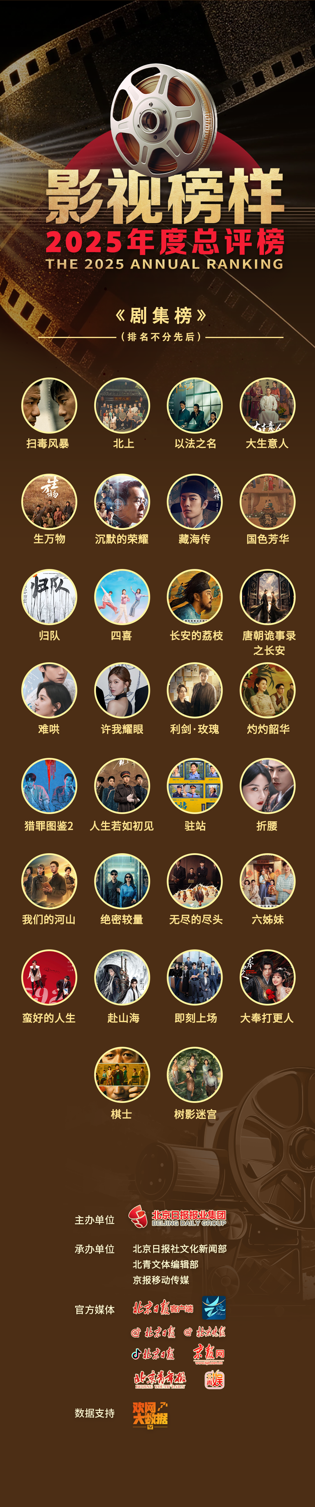 “影视榜样·2025年度总评榜”自11月中旬开始遴选初选作品,在面向社会公众和行业各方公开征集入选作品的同时,接受影视制作公司、视频网站、地方卫视与专业数据机构的推荐报送。截至12月1日,累计收到2025年度重点影视剧、综艺节目近200部,经过组委会内部初选,从剧集、综艺两大门类中,分别选出前30名作品入围“影视榜样·2025年度总评榜”初选榜单。