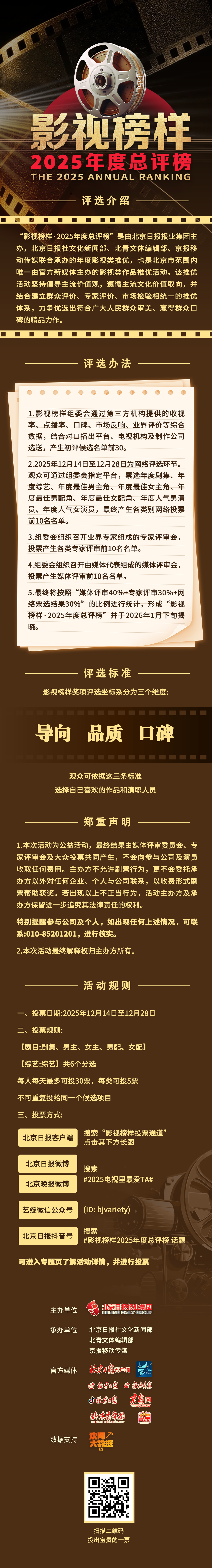 12月14日,“影视榜样·2025年度总评榜”网络票选系统正式上线,自14日起至28日,观众可在两周内为自己喜欢的影视剧综艺作品和演员投票。