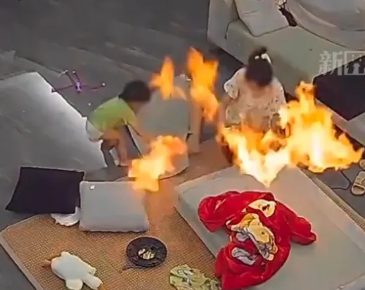 孩子的头发瞬间被点燃