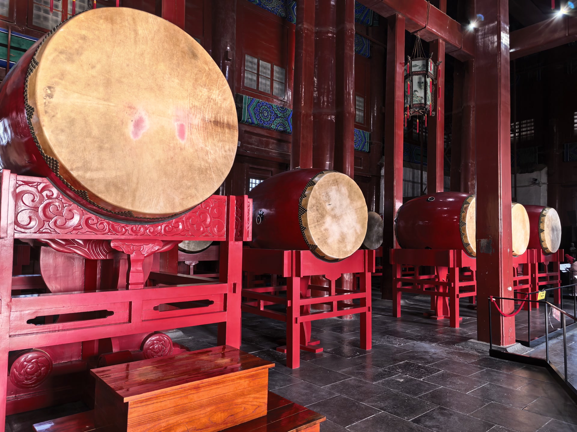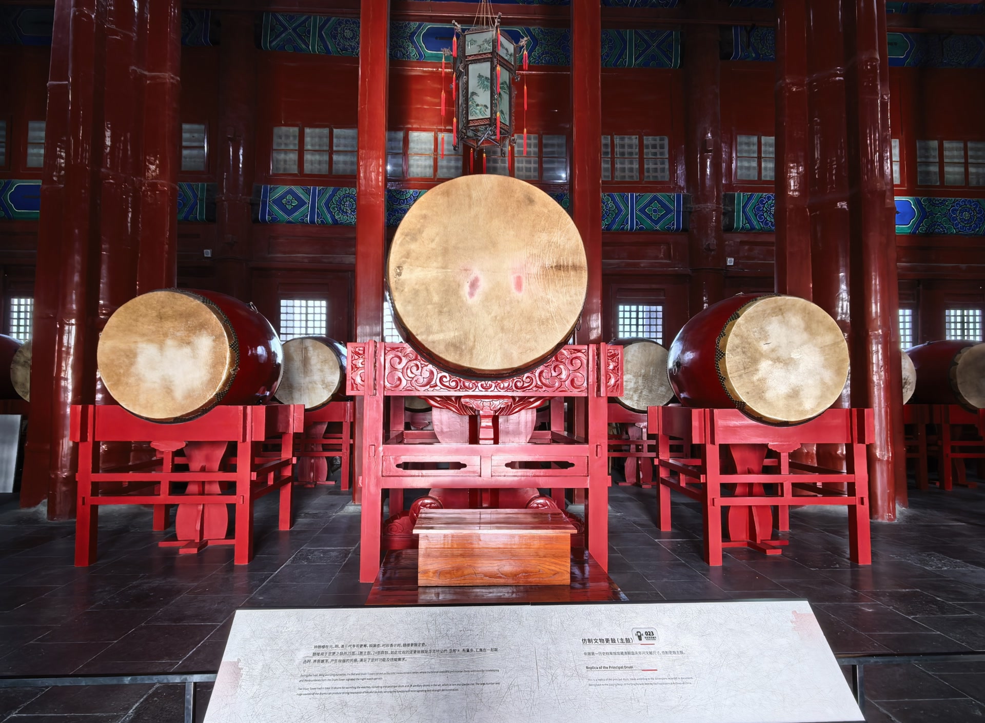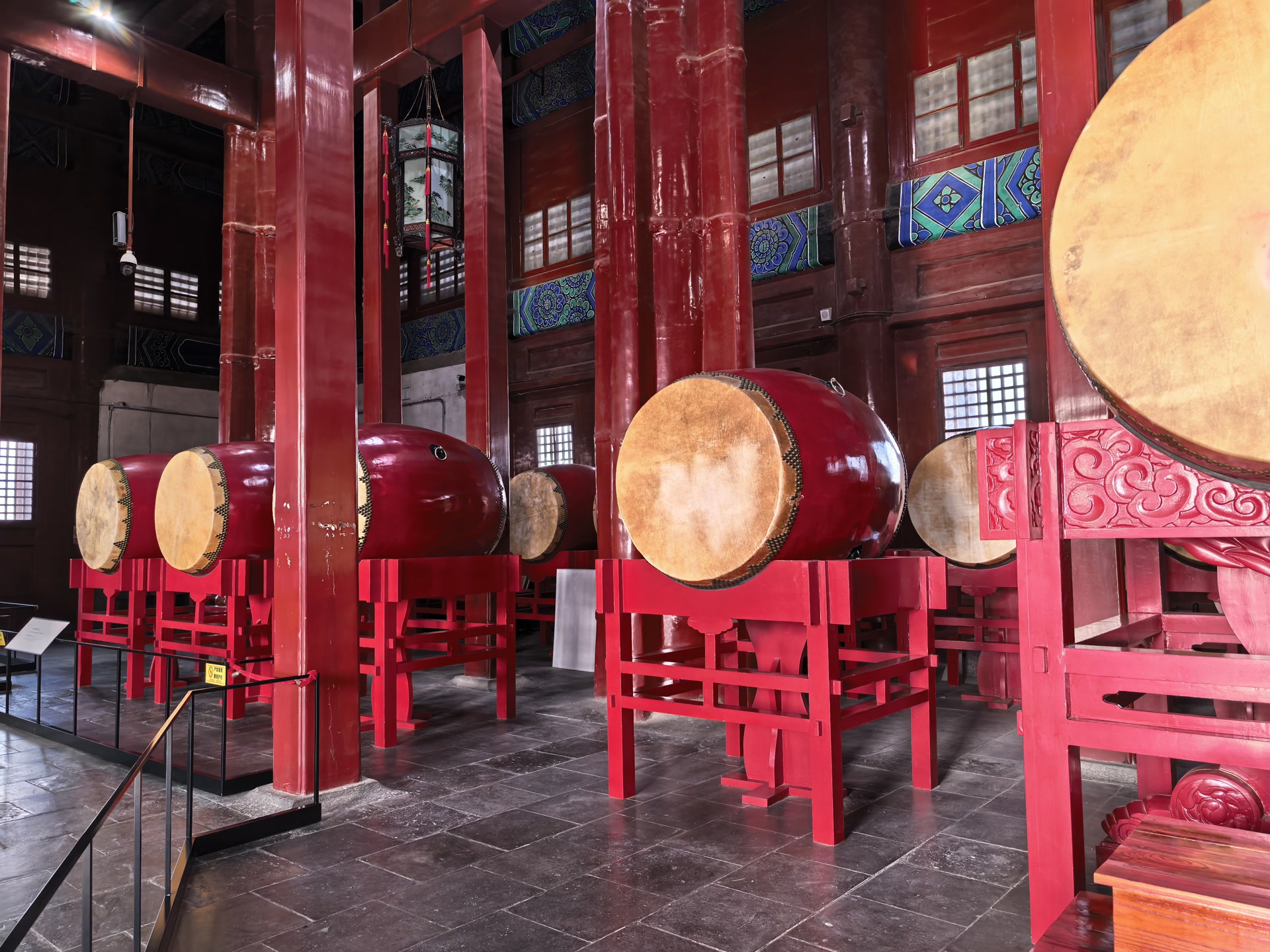 购票进入鼓楼二层,二十五面更鼓列阵以待。最大的主鼓鼓面直径约一点七米,鼓身绘有金色云龙纹。讲解牌说明,这些是1987年仿制的,原有鼓器多已不存。1900年,八国联军曾刺破主鼓,1949年前仅存残缺鼓皮。此刻,鼓面蒙着一层极细的尘埃,在从木格窗透入的雪光中,尘埃如同悬浮的时间颗粒。