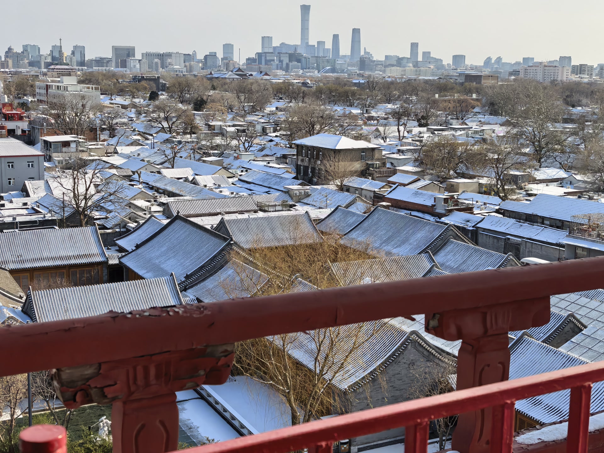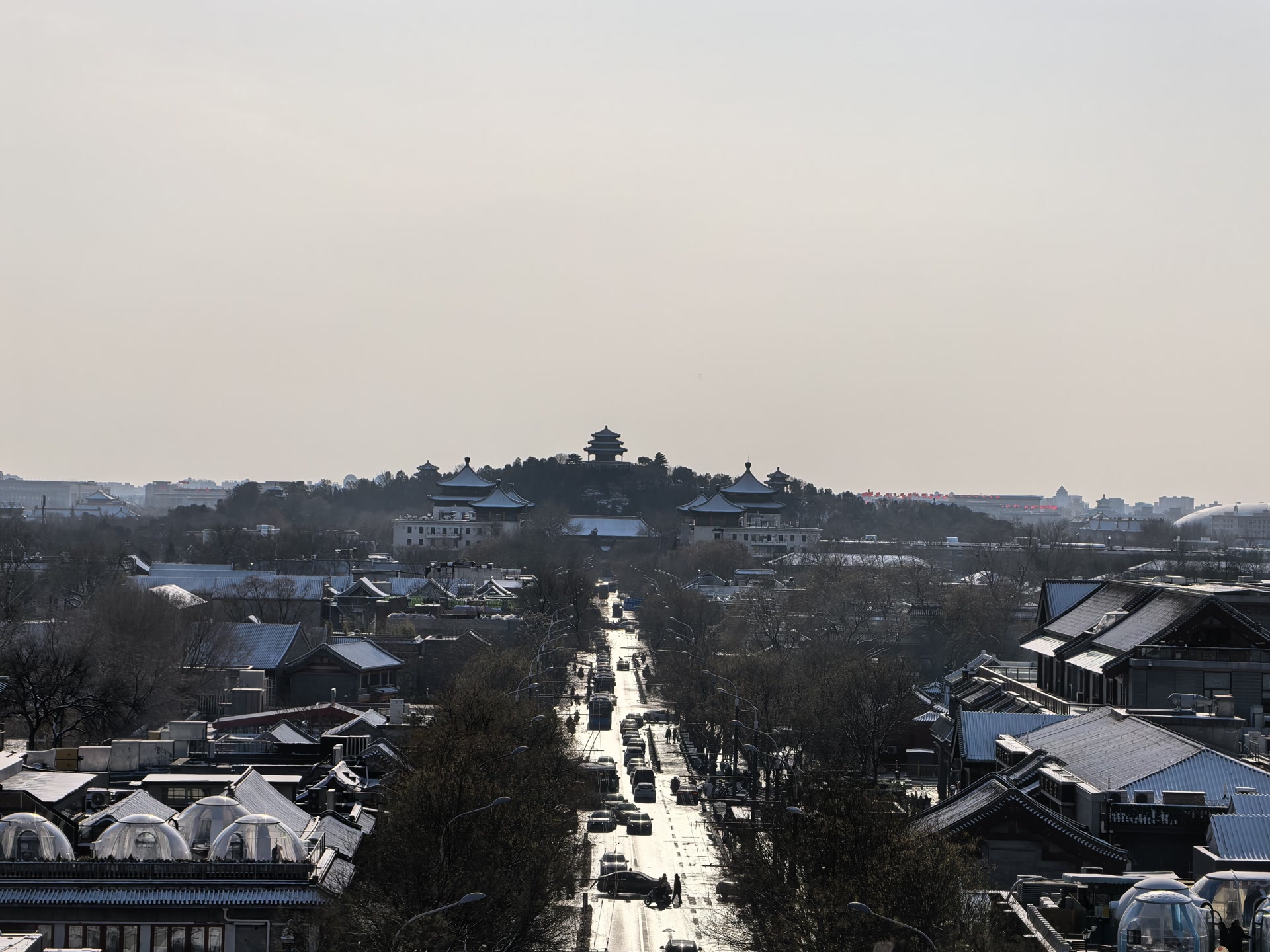 最重要的是,这里能看到完整的中轴线。雪让这条线更加清晰:从钟楼开始,向南经鼓楼、万宁桥、景山、故宫、天安门、正阳门,直至永定门。这不是一条笔直的线,而是一系列建筑的韵律,一种空间的节奏。