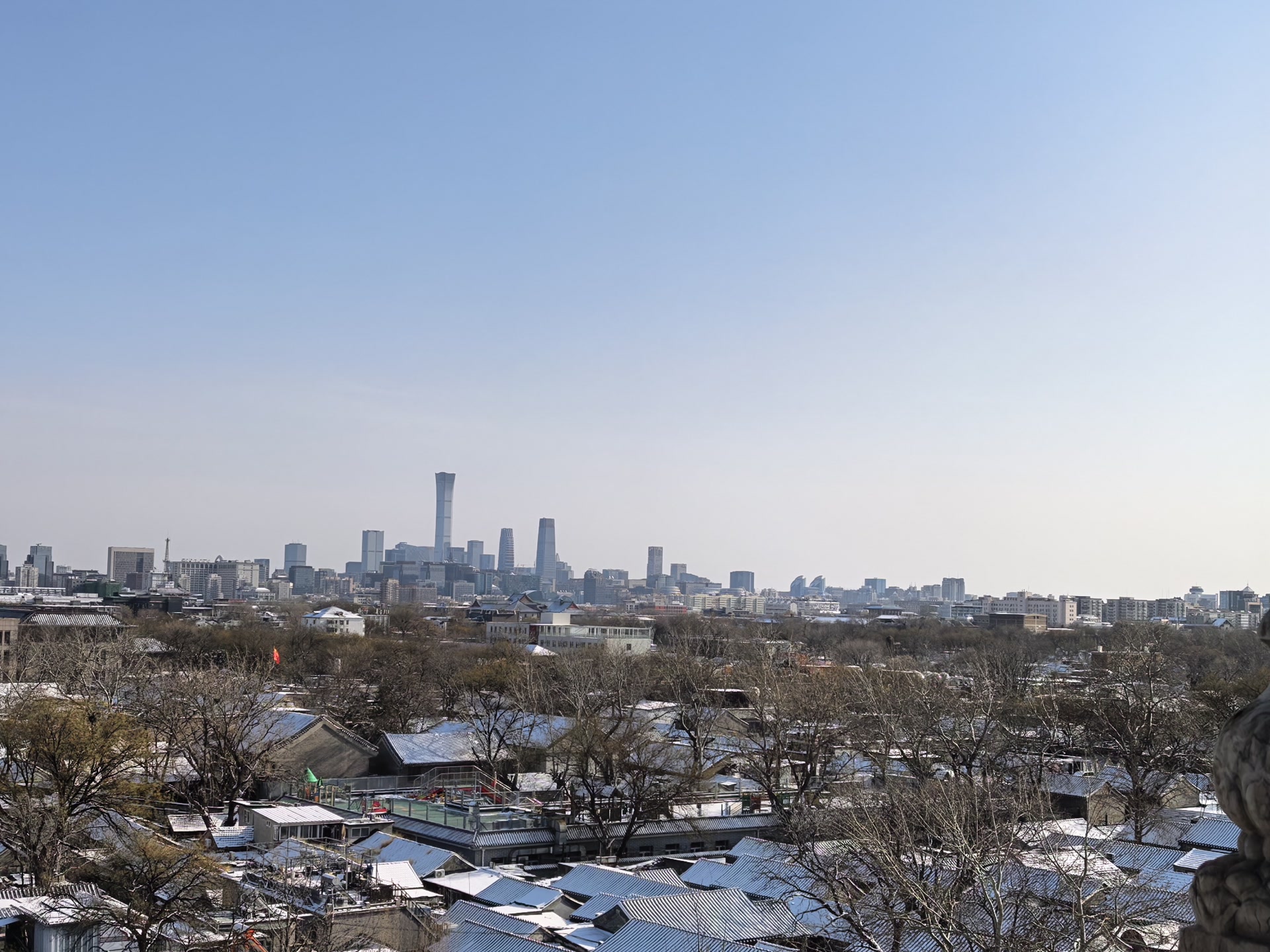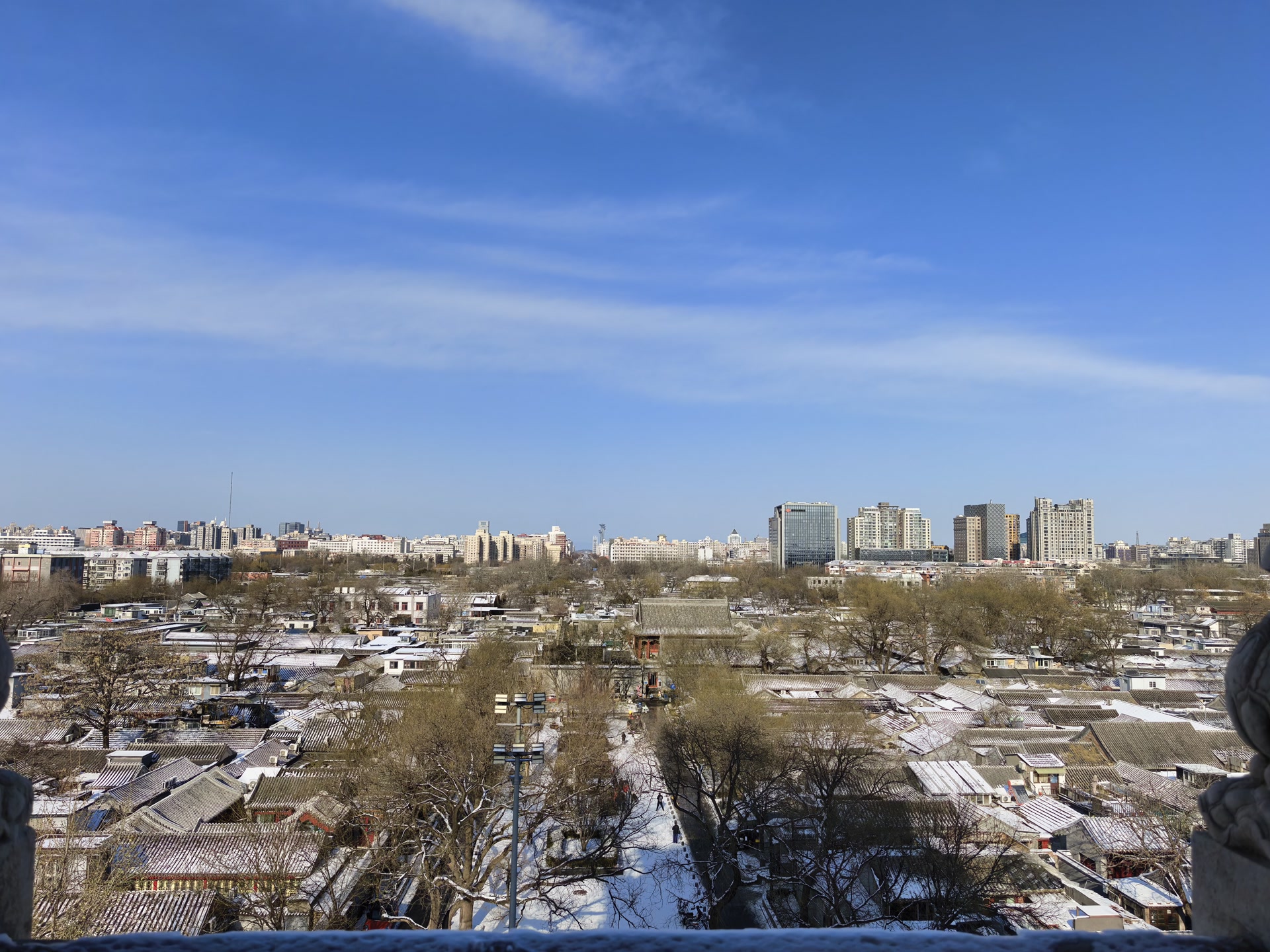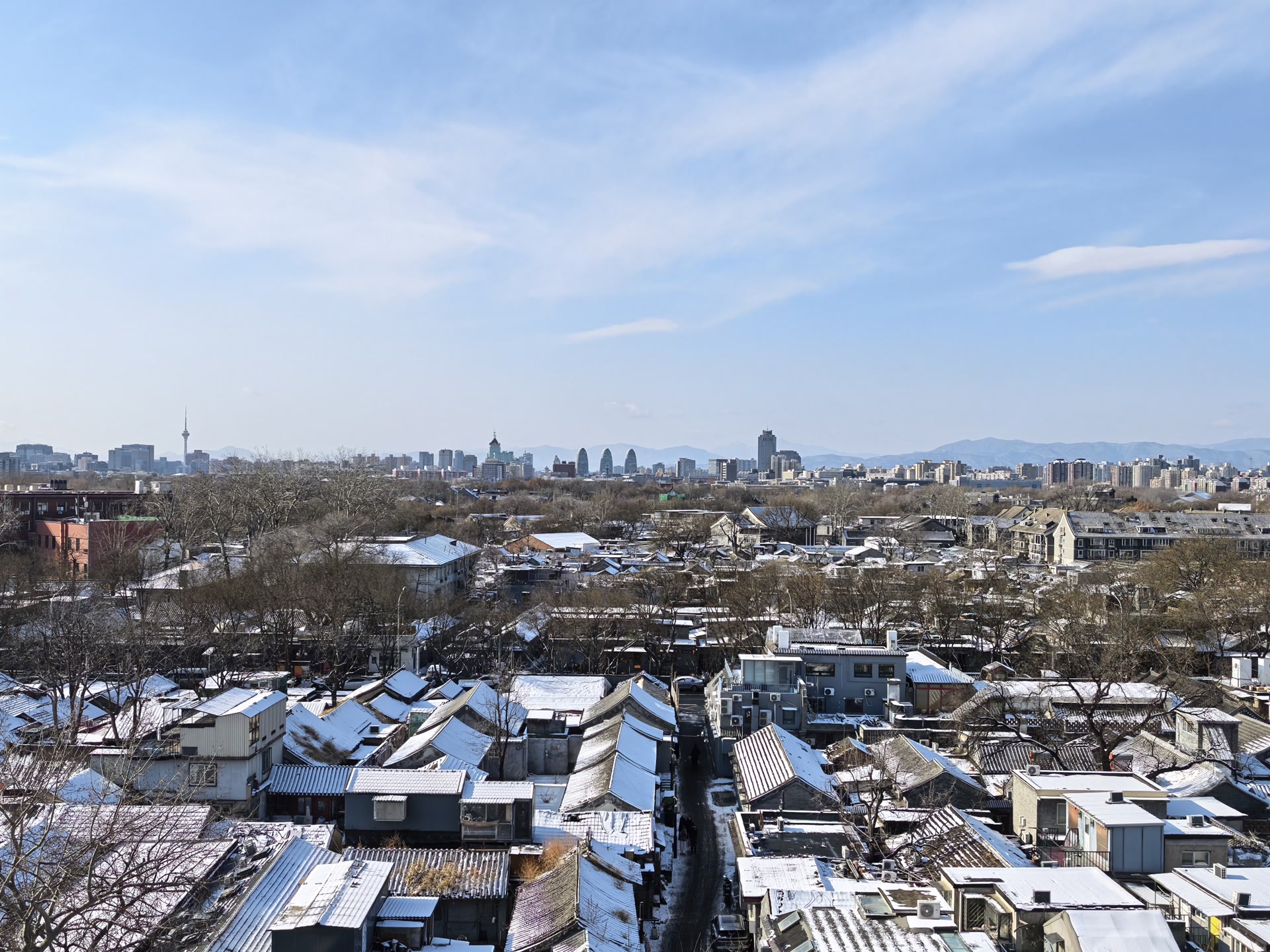 从钟楼顶层向外眺望,视野比鼓楼更加开阔。向南,鼓楼的灰瓦屋顶铺展如棋盘;向北,德胜门箭楼隐约可见;向东,望见中国尊的现代轮廓;向西,西山积雪的峰峦在天际勾勒出淡蓝色的曲线。