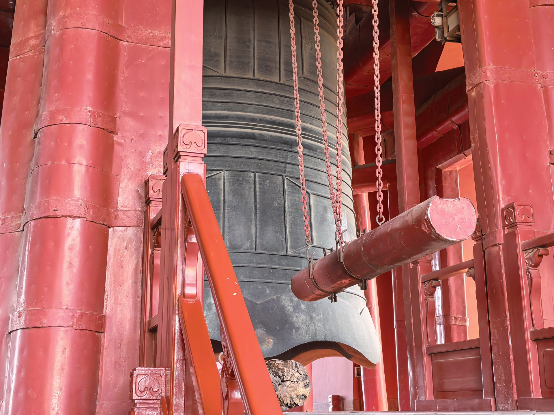 沿着陡峭的砖石旋梯攀登,到达二层钟亭。亭中央悬挂着明永乐年间铸造的铜钟,通高五点五米,直径三点四米,重约六十三吨。这是中国现存最重的大钟之一。