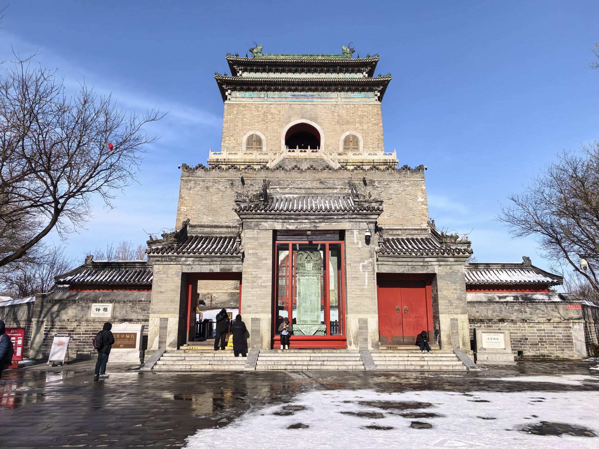 离开孔庙的棂星门,雪霁初晴,铅灰色的云层裂开缝隙,洒下跳跃的冬日阳光。我沿着安定门内大街南行,转向旧鼓楼大街。据元代《析津志辑佚》记载,元大都的中心台便设在今鼓楼位置,而钟鼓楼作为“晨钟暮鼓”的报时中心,自元代起便矗立在北京城的中轴线北端。