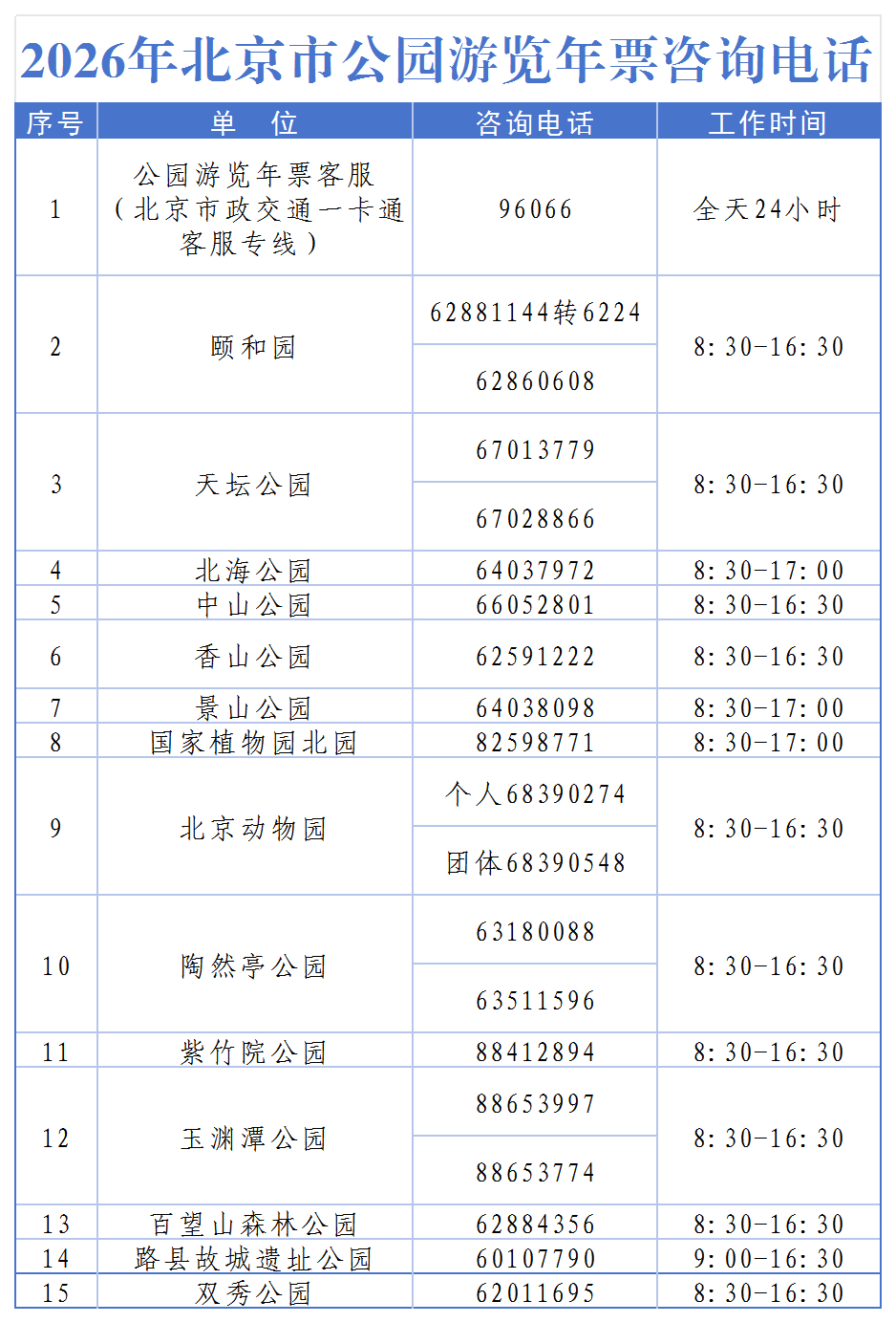 注:景山公园西门、陶然亭公园东门、玉渊潭公园东门、中山公园西门4处为2026年北京市公园游览年票线下常设发售点,2026年1月16日至2026年10月20日每日8:30至16:30仍可办理。