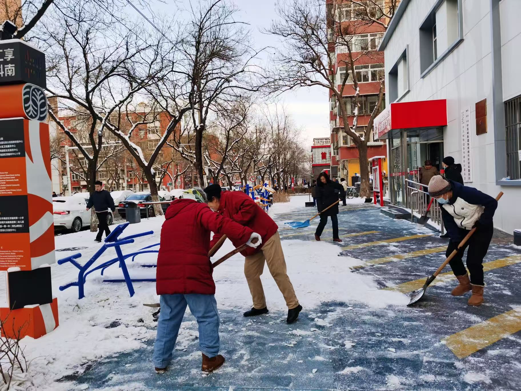 12日中午,北京今冬初雪到来。下午地面出现积雪后,各街镇、社区(村)迅速组织社会力量参与扫雪铲冰。