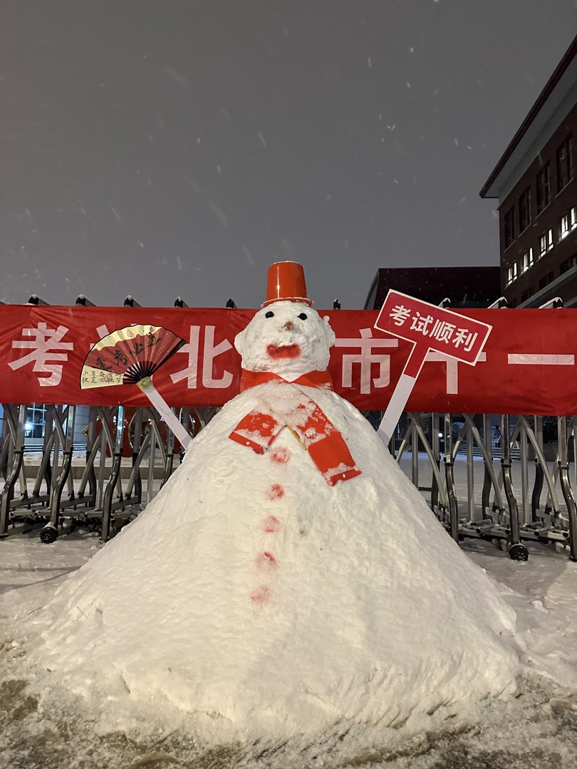 在十一学校大门口,一位被连夜堆砌成型的红帽红领的雪人左手持“考试顺利”手牌,右手折扇打开,露出“逢考必过”四个大字,十分可爱喜庆,吸引考生们纷纷打卡。正是通过志愿者们披星戴月的努力,浮雪积冰成为带有美好祝愿的临时地标,扫铲铲冰的力度在此刻也被赋予了服务保障的温度。