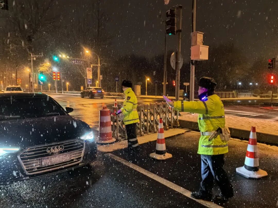 记者在北坞村路看到,民警身着反光执勤服,在夜色中形成醒目的安全标识。他们顶着寒风大雪,手持指挥棒在路口中央疏导车流,通过灯光示意、喊话提醒等方式,引导车辆减速慢行、保持安全车距。“夜间雪天视线差,结冰路面刹车距离延长,一定要提前观察路况!”执勤民警一边指挥,一边叮嘱驾驶人行车要点。遇到车辆抛锚、打滑等突发状况,民警第一时间上前协助推移车辆、清理障碍,快速恢复交通。