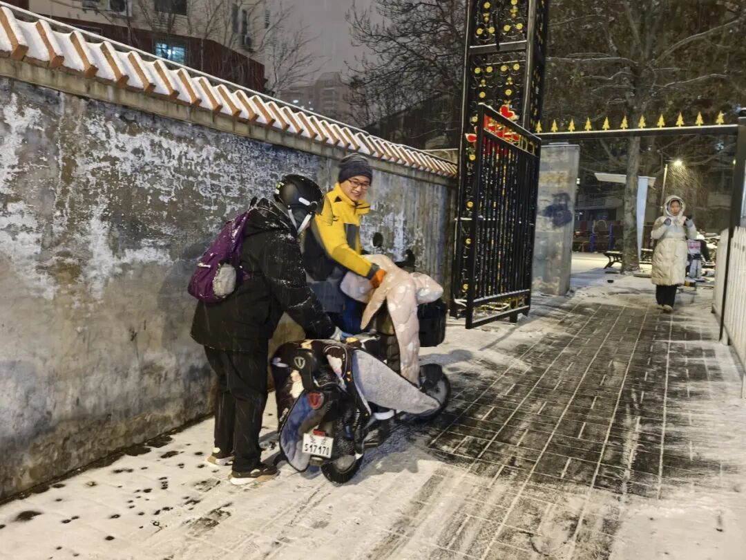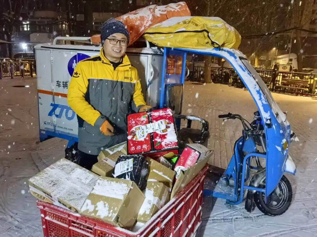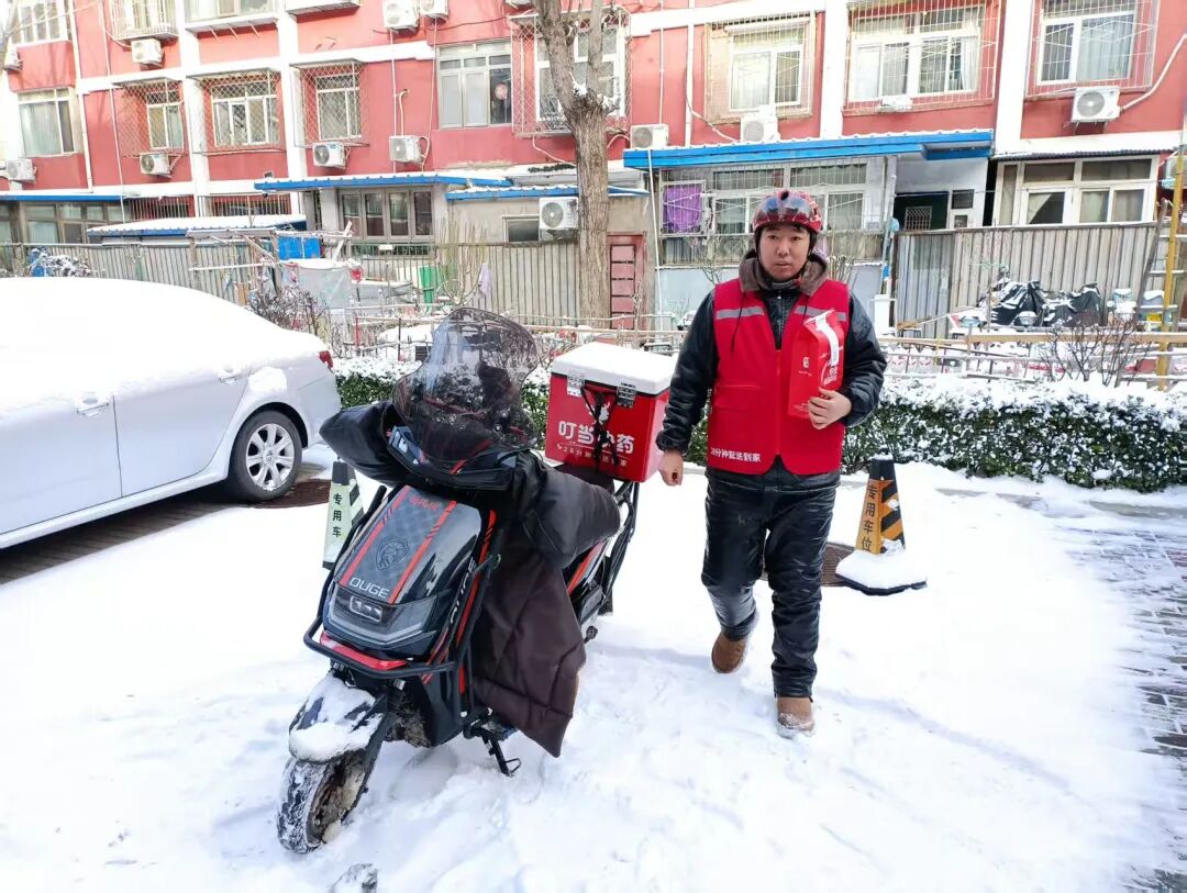 “您好,您的快递已经放家门口了,请查收!”“下雪天,水果容易放坏,赶快给您送过来了。”12月12日,菜鸟驿站北京海淀莲宝路十号院店站长陈著,如往常一样坚守在工作岗位,奔波在配送快递的路上。