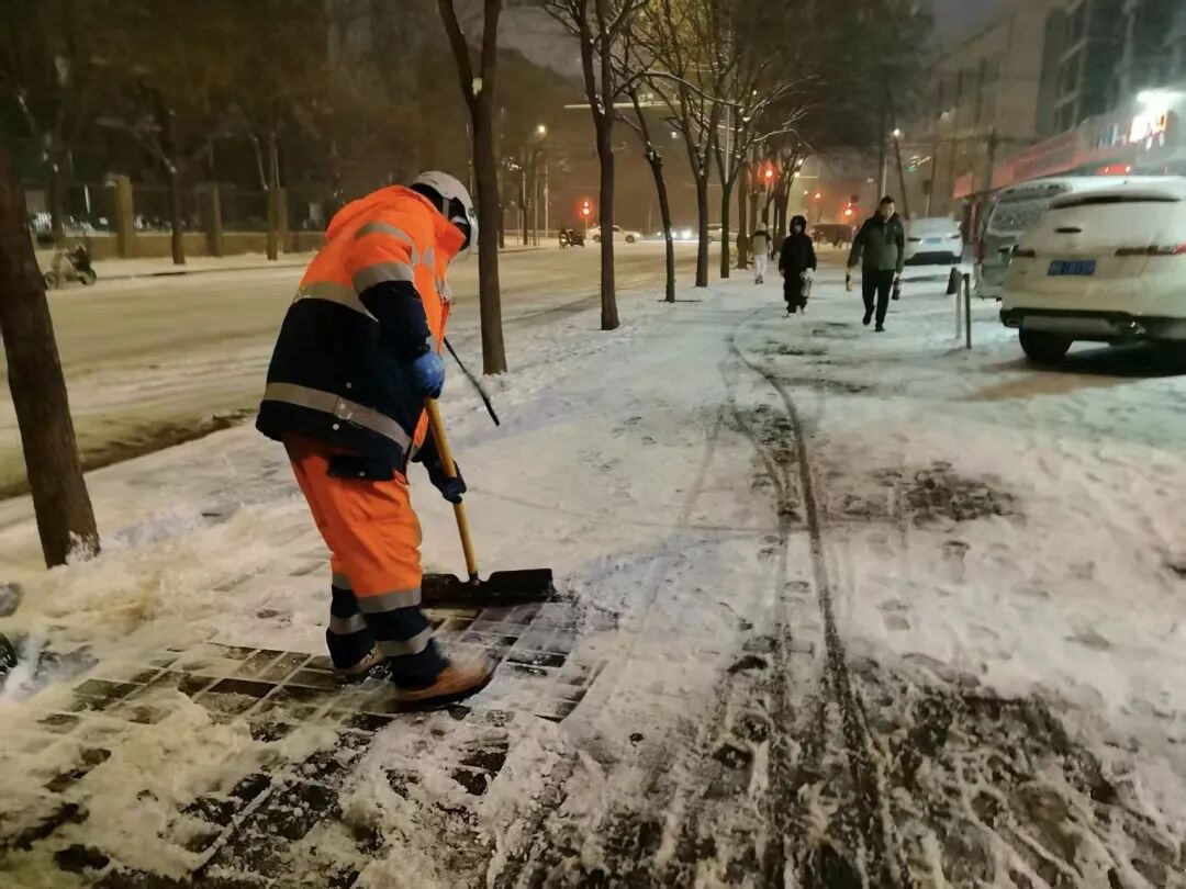 夜深了,雪下得更密了,车队还在主干道循环作业;等凌晨雪势稍缓,他们又马不停蹄转向背街小巷。