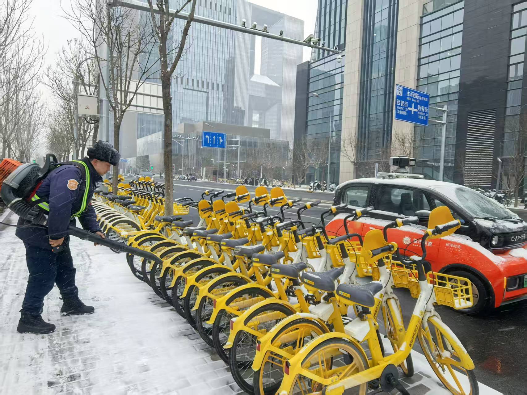 不远处,另一位工作人员同样用吹雪机清除停放在路边共享自行车、电动车座上的积雪。这些暖心举措,正是丽泽此次扫雪铲冰工作中“温度”的缩影,让市民从细节处感受到出行的便捷与关怀。