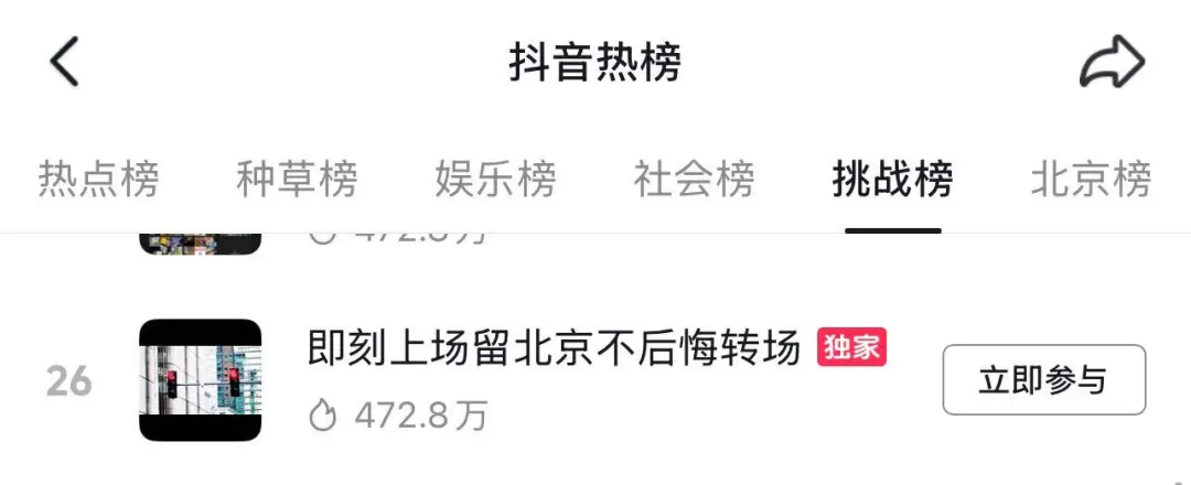 打开抖音搜索#即刻上场留在北京不后悔转场#即可加入挑战。快去录个视频,表白北京,表白那个曾一腔孤勇“即刻上场”的自己吧!
