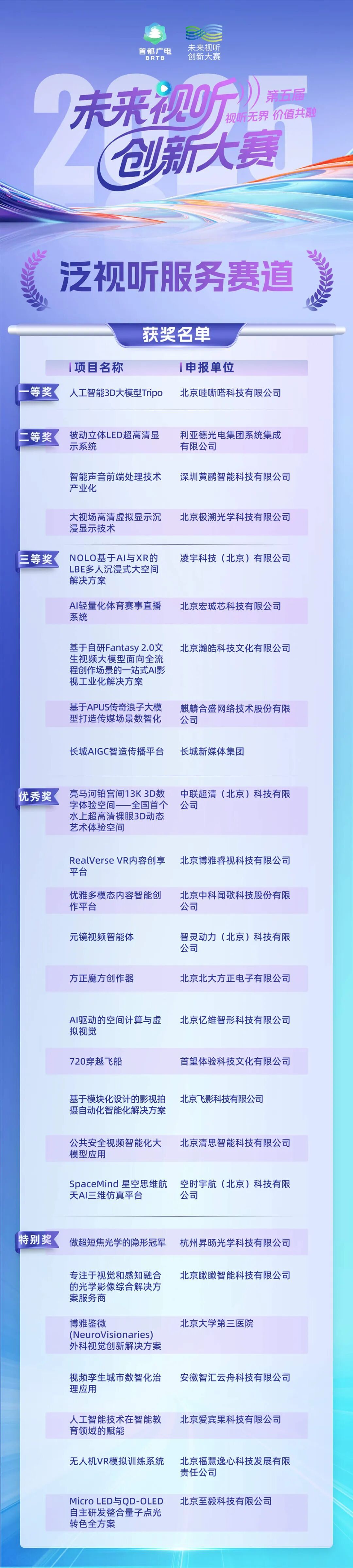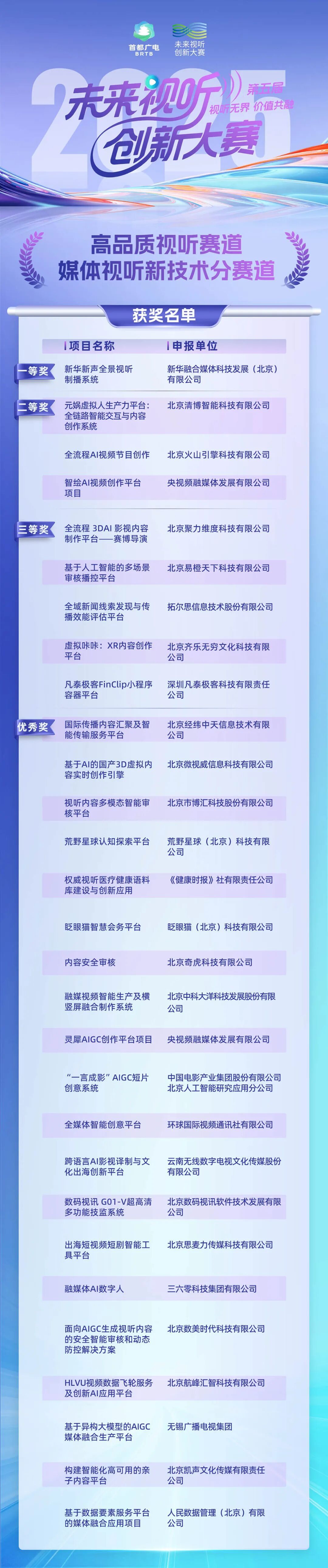 本届大赛自2025年9月启动以来,共收到全国389家单位提交的1436个作品和项目。经初赛、复赛评审及大赛组委会审议,选出高品质视听赛道中的“沉浸式交互视听”“AI智能影像”“媒体视听新技术”三个分赛道、泛视听服务赛道和京津冀大视听专项赛道的获奖作品、项目。