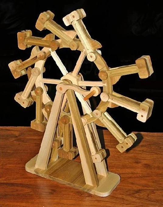 他们没有放弃,反复试验,反复校正控制杠杆和连杆的品字孔的比例,让杠杆和连杆把力量放大,经过50多次失败和试验,终于在第60次的试验中,成功地使七横八纵的木车在人力下压前拽的作用力下,现实了连锁反应,带动木牛流马前行,人力和杠杆连续作用,装满土石方的木牛、流马就连续工作了,解放了一部分人力的肩扛、挑担。