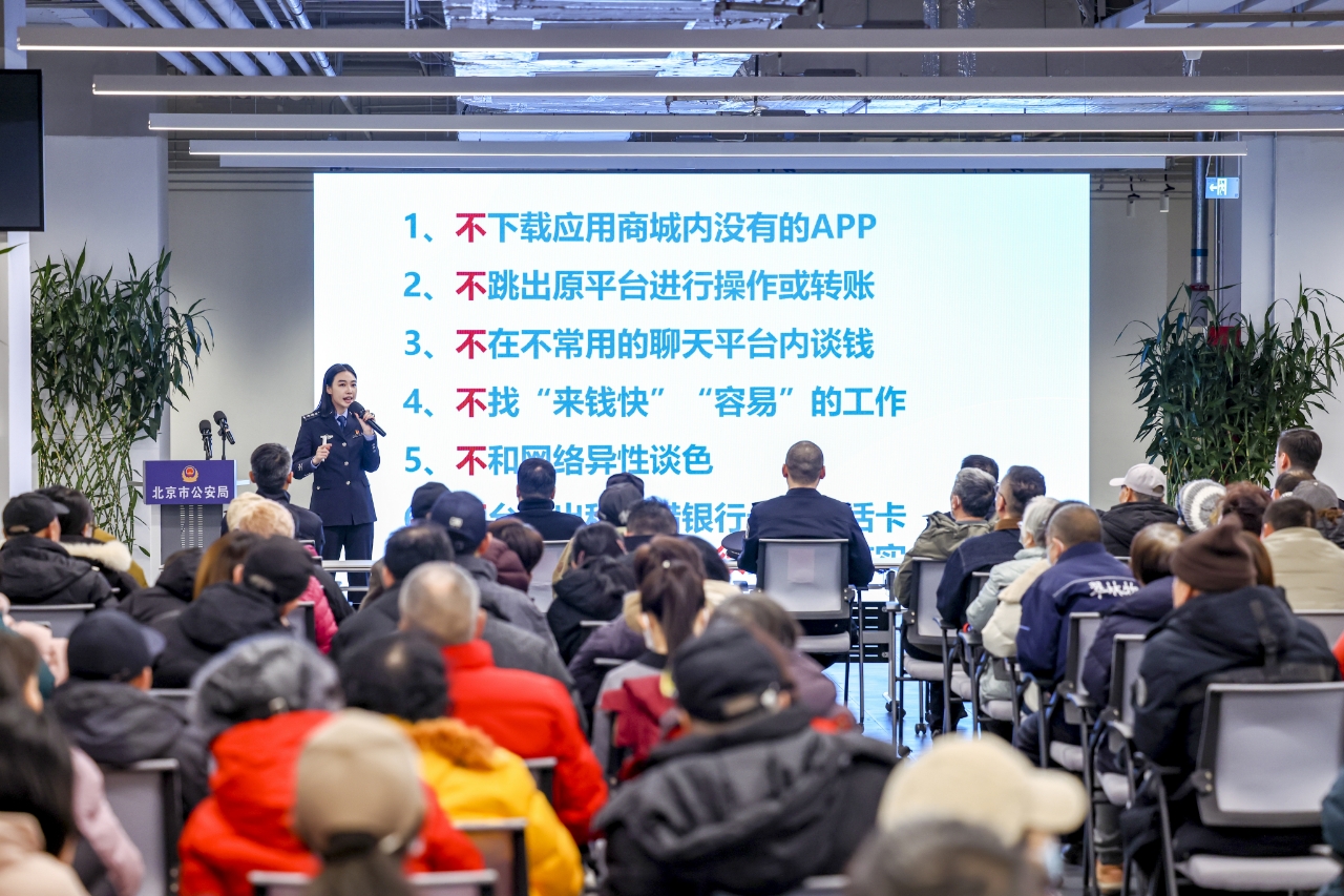 在市局人口基层总队会同丰台公安分局举行的主会场活动上,丰台公安分局人口基层大队民警围绕出租房屋治安管理,从出租登记、举报奖励、违法处罚等角度进行了政策宣讲;反诈中心民警对当前多发新发的电诈类型和防范要点,进行了重点提示;治安支队民警结合《北京市人民政府关于公布无人驾驶航空器管制空域范围的通告》、入住旅店实名登记等相关内容,与现场群众进行互动问答;右安门派出所通报了辖区治安形势,社区民警则介绍了冬季入室盗窃案件发案规律特点,提示居民通过更换C级锁等方式,强化防范应对能力。同时,针对冬季防火以及徒步登山安全等注意事项,邀请丰台消防救援支队消防员到场开展安全宣讲。