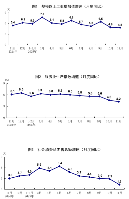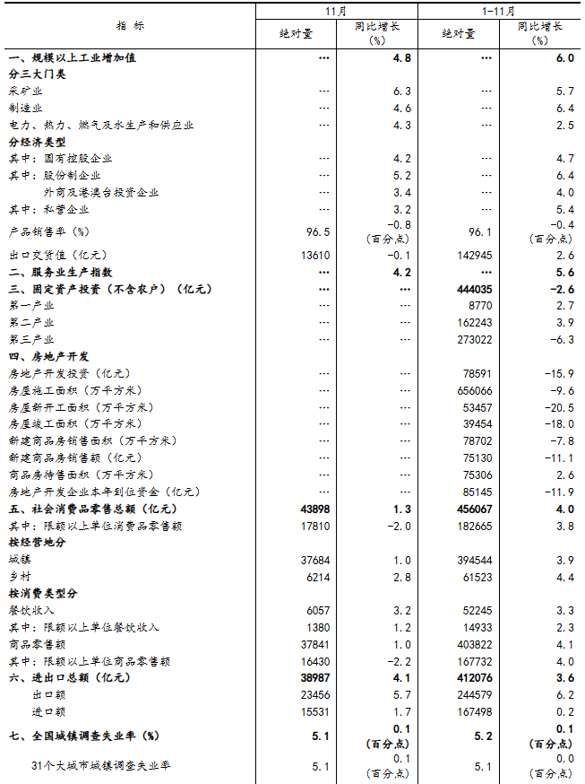 11月份,全国规模以上工业增加值同比增长4.8%,环比增长0.44%。分三大门类看,采矿业增加值同比增长6.3%,制造业增长4.6%,电力、热力、燃气及水生产和供应业增长4.3%。装备制造业增加值同比增长7.7%,高技术制造业增加值增长8.4%,分别快于全部规模以上工业增加值2.9和3.6个百分点。分经济类型看,国有控股企业增加值同比增长4.2%;股份制企业增长5.2%,外商及港澳台投资企业增长3.4%;私营企业增长3.2%。分产品看,3D打印设备、工业机器人、新能源汽车产品产量同比分别增长100.5%、20.6%、17.0%。1-11月份,全国规模以上工业增加值同比增长6.0%。11月份,制造业采购经理指数为49.2%,比上月上升0.2个百分点;企业生产经营活动预期指数为53.1%,上升0.3个百分点。1-10月份,全国规模以上工业企业实现利润总额59503亿元,同比增长1.9%。