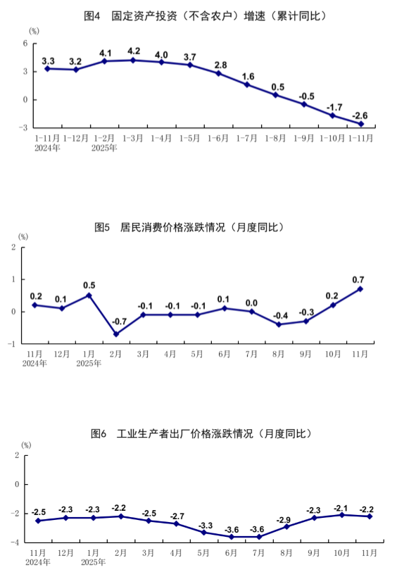 11月份,全国工业生产者出厂价格同比下降2.2%,环比上涨0.1%;全国工业生产者购进价格同比下降2.5%,环比上涨0.1%。1-11月份,全国工业生产者出厂价格和购进价格同比分别下降2.7%、3.1%。