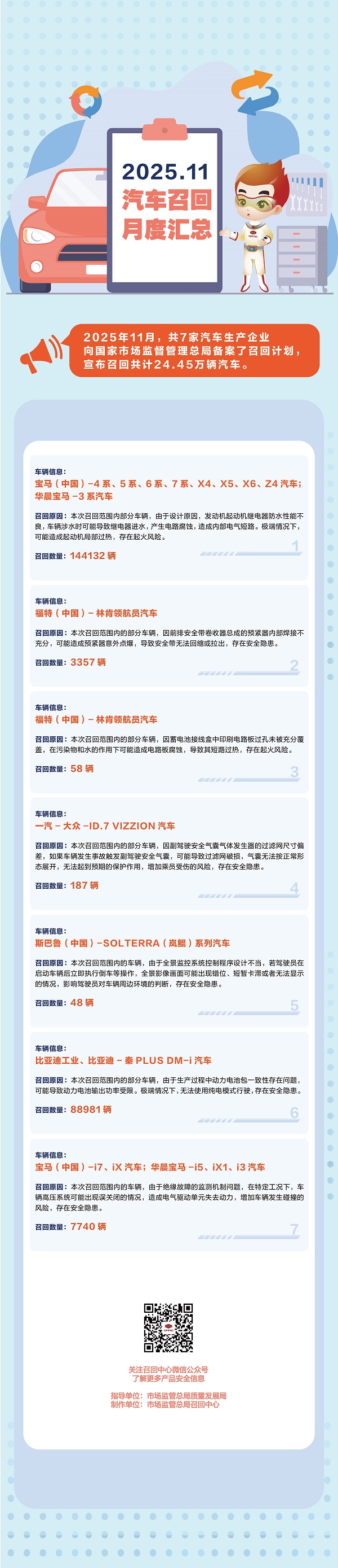 市场监管总局:11月7家汽车生产企业共召回24.45万辆汽车