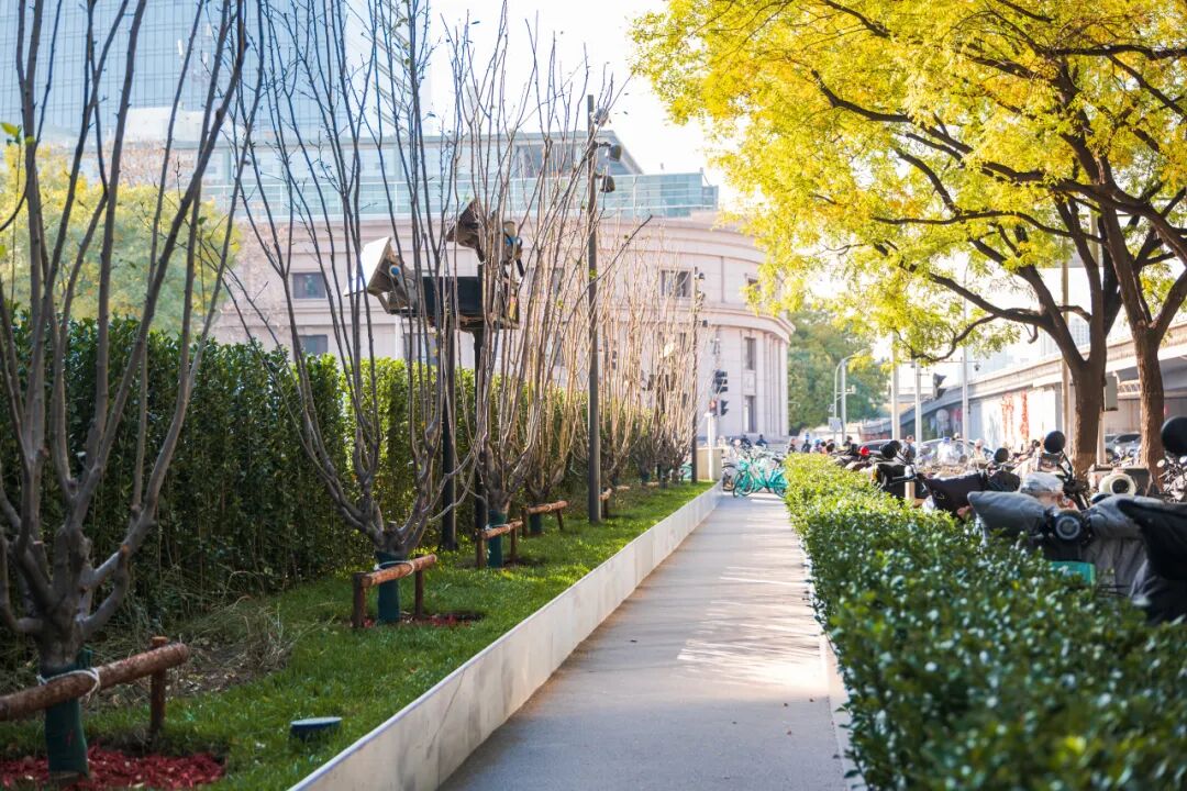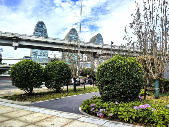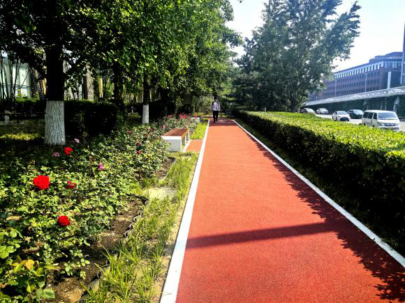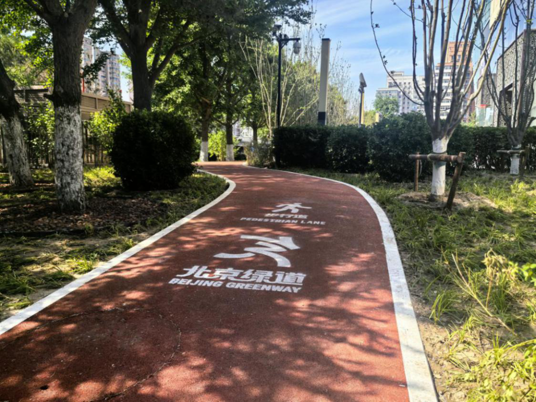 除了西直门地铁站B口,环二环绿道上的其他四处重要节点也从保障道路安全、提升绿道品质出发进行改造,形成了各有千秋的绿道景观。天宁寺桥区中国移动创新大楼西北绿地充分利用绿道两侧的现有林下空间,开辟了一处林下儿童活动场地和一处休闲健身场地;大成广场北侧绿地在现有绿地内增设188米绿道,将中部废弃喷水池改造为绿地花池;复兴门桥东南角天银大厦西侧绿地新增190米绿道,两侧配植月季和大花绣球;官园桥至中海国际西侧绿地打通了车公庄地铁出口与顺城公园之间的连接,绿道两侧增加了休息座椅和植被景观……五处节点的特色景观与环二环绿道西城段上的58个标识牌和330个地面引导串联起来,使环二环绿道形成一条连续畅通、舒适便利、生态美观的慢行系统。