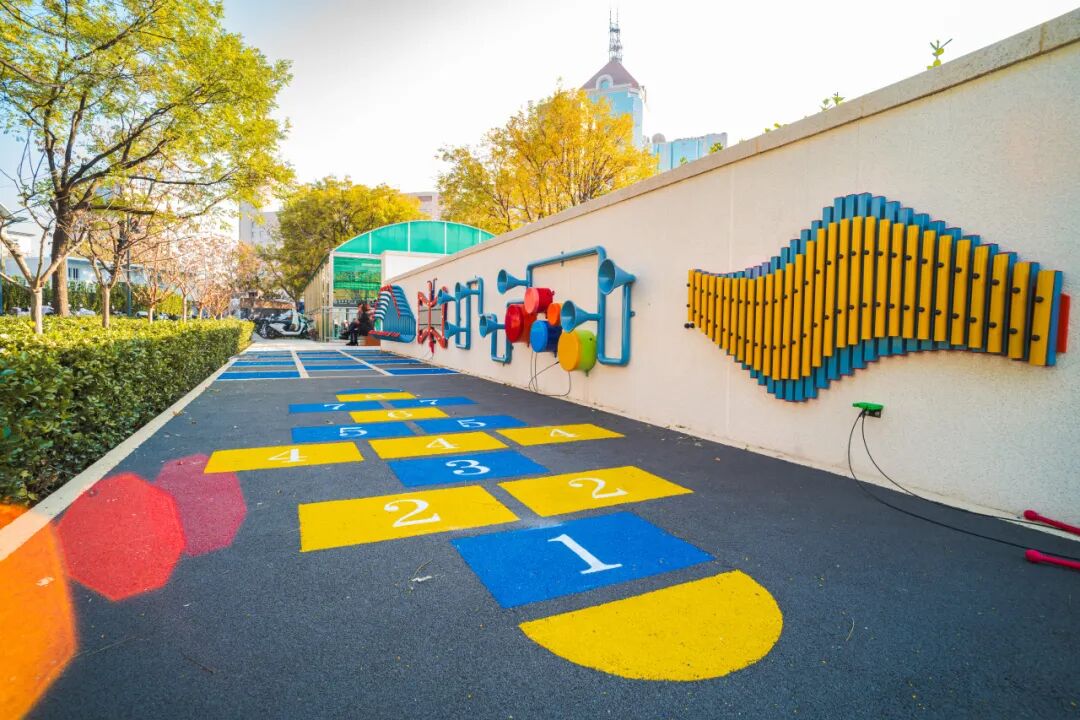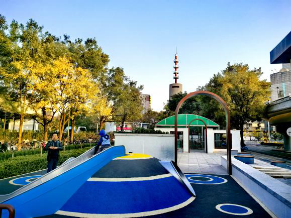 作为环二环绿道上的5个重要空间节点之一,西直门地铁站B口对空间环境的优化不仅仅体现在对电动车的停车治理上。区园林绿化局利用现状墙体,结合提取了城门元素的拱形门,将空间自然分隔成为展示西直门历史变迁的文化休闲场地和趣味儿童活动场地。地铁站外,简约大气的台阶座椅错落有致地分布,供行人在都市生活的快节奏中得以放慢脚步,坐下小憩。放学后的孩子们敲起墙面上铺陈的木琴与打击鼓,深厚的历史积淀与蓬勃的城市活力在此奏成一曲和谐的乐章。