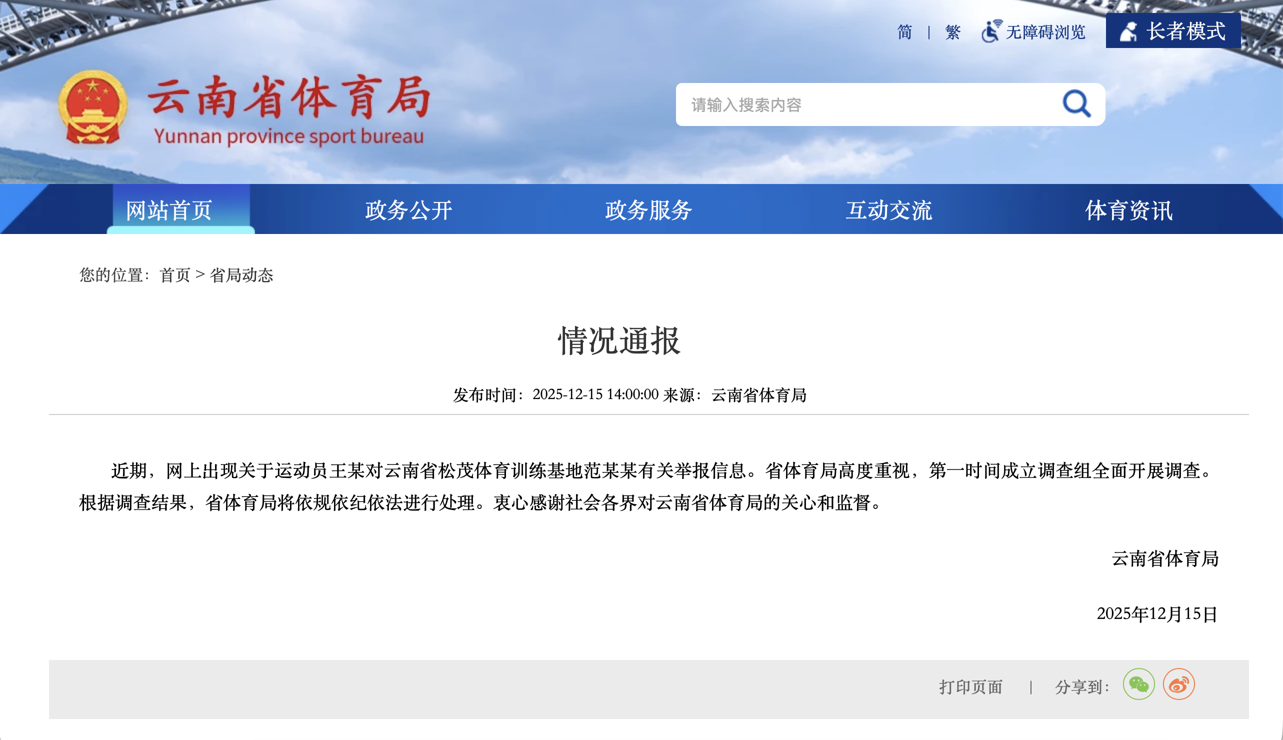 近期,网上出现关于运动员王某对云南省松茂体育训练基地范某某有关举报信息。省体育局高度重视,第一时间成立调查组全面开展调查。根据调查结果,省体育局将依规依纪依法进行处理。衷心感谢社会各界对云南省体育局的关心和监督。