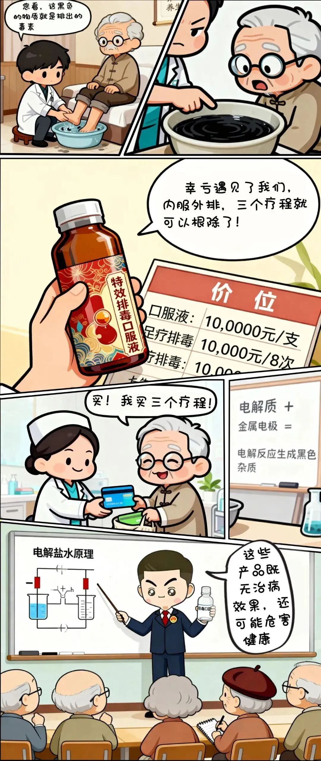 警惕“洗脚排毒”“包治百病”的养生骗局!不法分子常利用电解盐水化学反应变黑的现象,谎称体内有“毒素”,诱导老年人高价购买毫无效果的“排毒口服液”。实际上,这些产品既无治病效果,还可能危害健康。