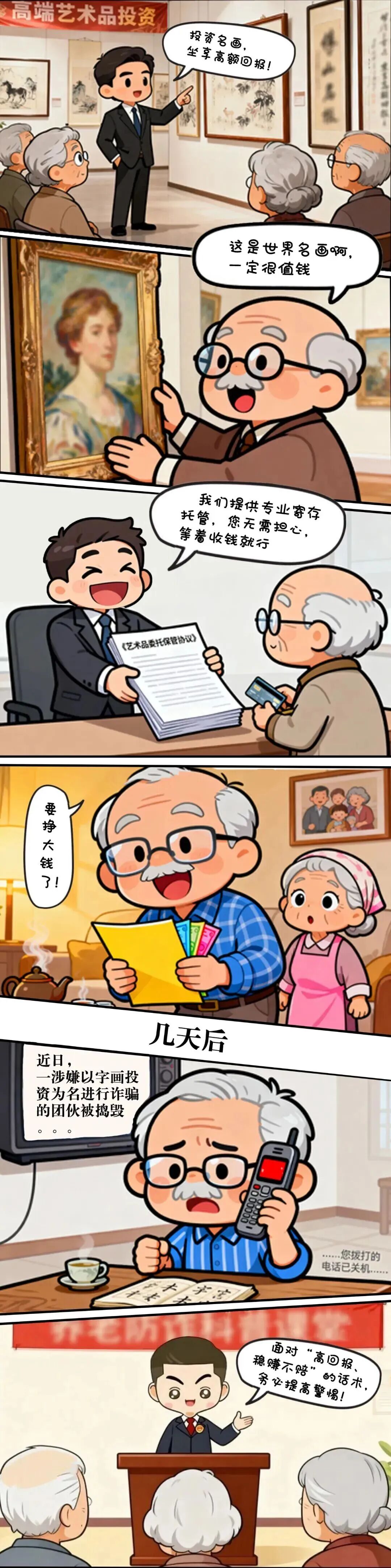 面对“高回报、稳赚不赔”的字画、艺术品投资宣传,务必警惕!不法分子常以“高额收益”“托管服务”为诱饵,实则用毫无价值的复制品骗取老人的养老金。