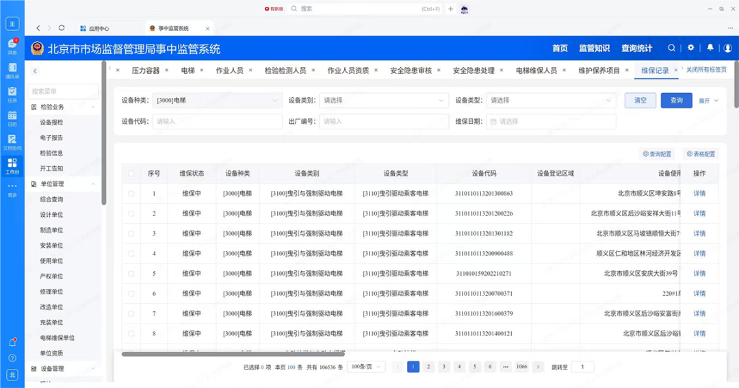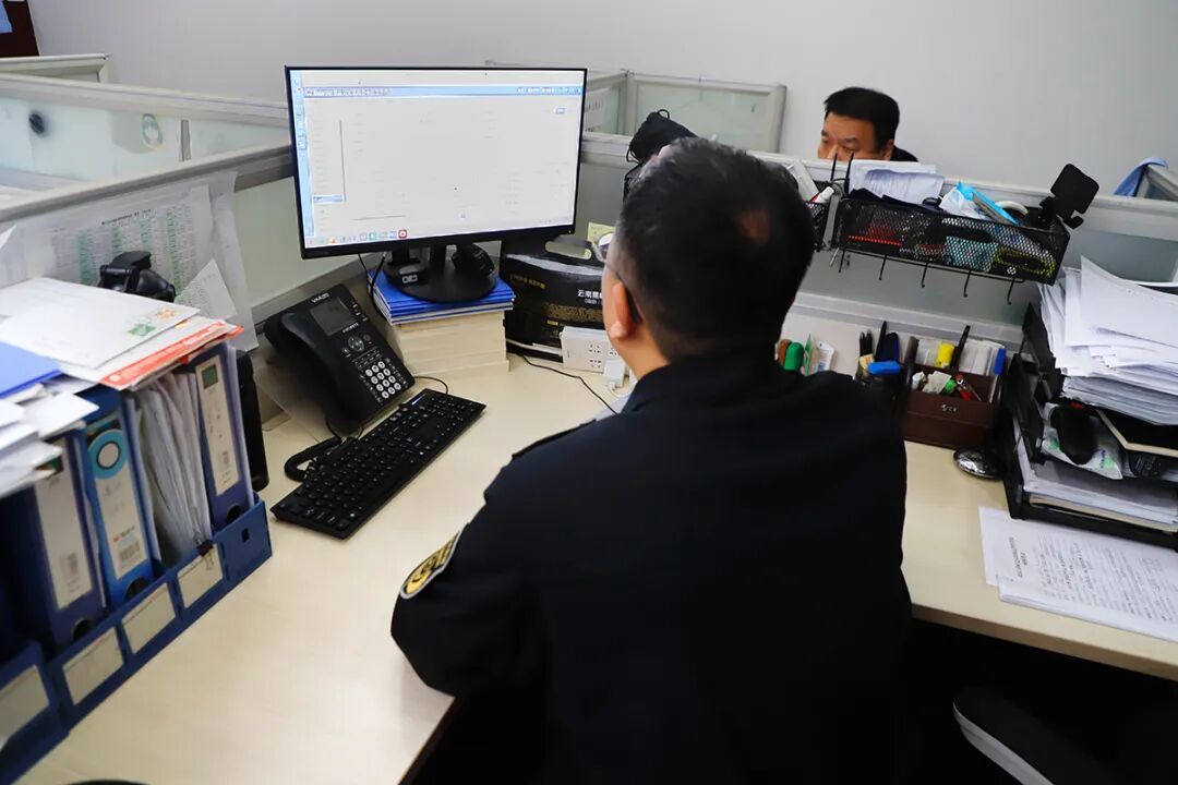 区市场监管局临空经济区市场所内,执法人员通过“特种设备智慧监管系统”开展非现场监管,通过后台查询特种设备基本信息、维护保养及检验检测记录等,监督企业特种设备使用管理情况。