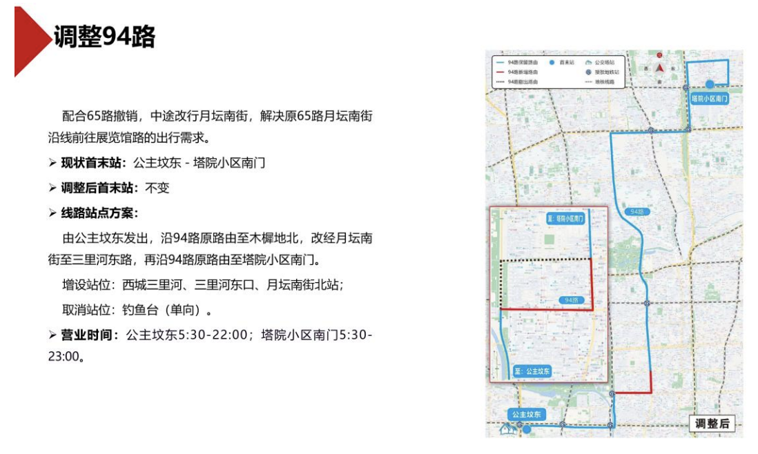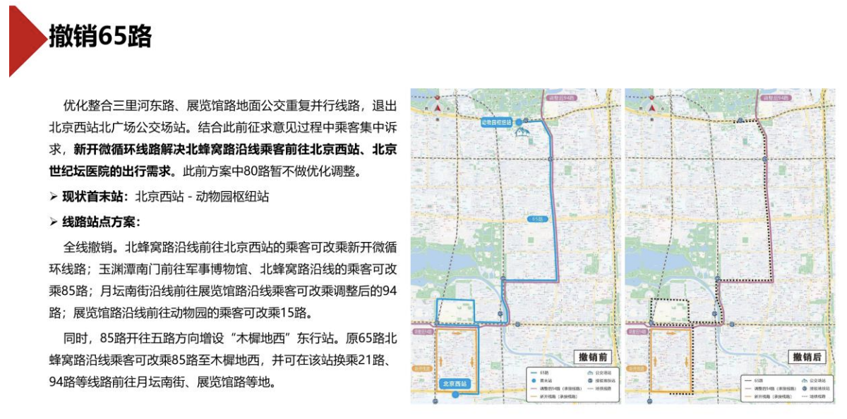该方案还计划撤销65路,新开微循环线路、调整94路。具体来讲,优化整合三里河东路、展览馆路地面公交重复并行线路,退出北京西站北广场公交场站。配合65路撤销,结合此前征求意见过程中乘客集中诉求,新开微循环线路,满足北蜂窝路沿线乘客前往北京西站、北京世纪坛医院的出行需求。