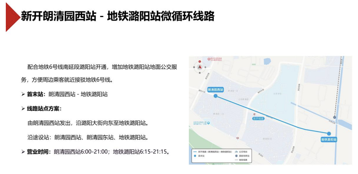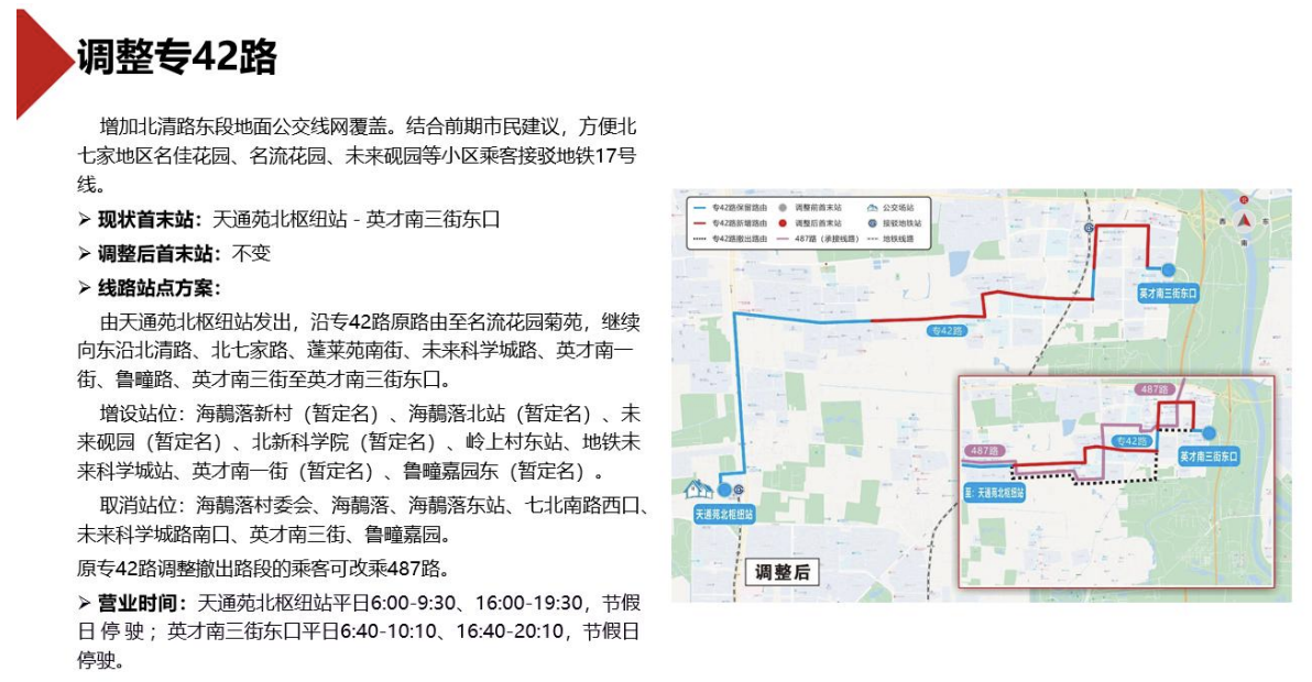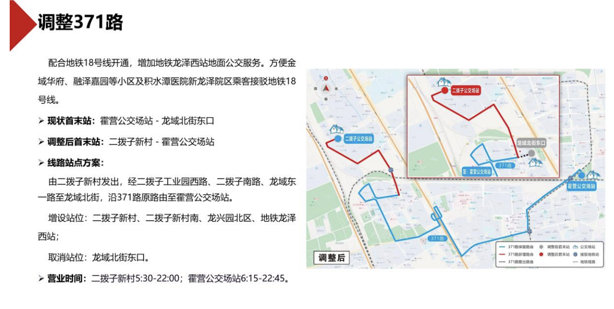 此外,配合年底地铁18号线开通,拟调整371路,增设地铁龙泽西站等站,方便金域华府、融泽嘉园等小区及积水潭医院新龙泽院区乘客接驳地铁18号线。配合年底地铁6号线南延段潞阳站开通,拟新开朗清园西站-地铁潞阳站微循环线路,增加地铁潞阳站地面公交服务,方便周边乘客就近接驳地铁6号线。同时,为了方便北七家地区名佳花园、名流花园、未来砚园等小区乘客接驳地铁17号线,还计划调整专42路。