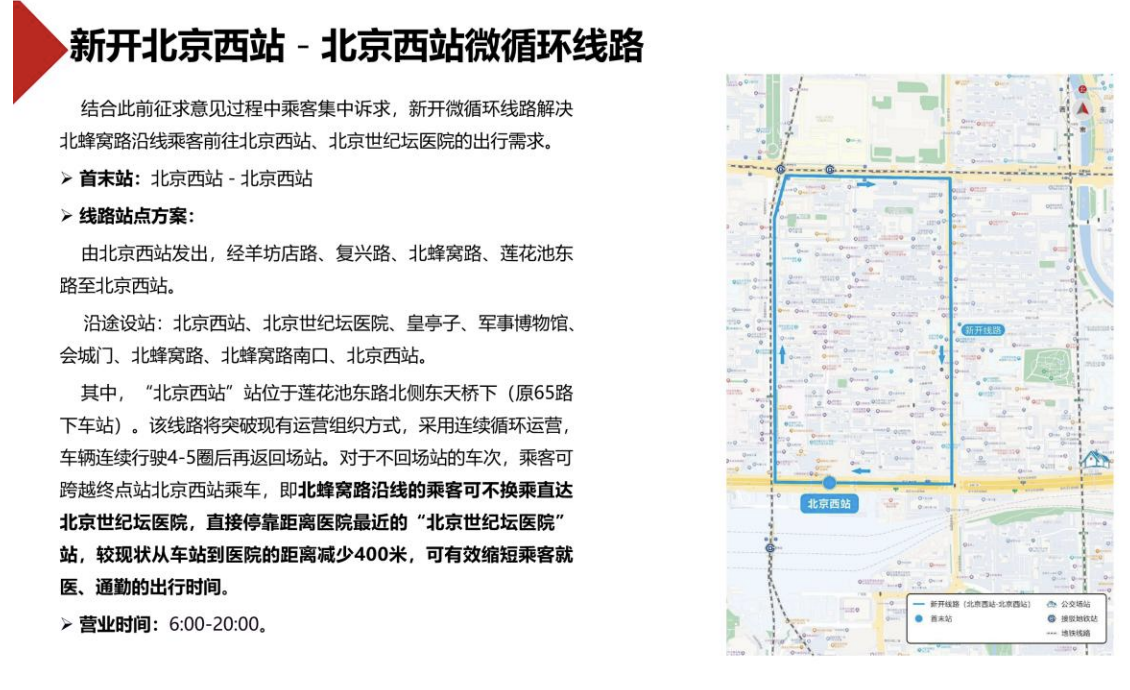根据方案说明,这条微循环线路由北京西站发出,经羊坊店路、复兴路、北蜂窝路、莲花池东路至北京西站。该线路将突破现有运营组织方式,采用连续循环运营,车辆连续行驶4-5圈后再返回场站。对于不回场站的车次,乘客可跨越终点站北京西站乘车,即北蜂窝路沿线的乘客可不换乘直达北京世纪坛医院,直接停靠距离医院最近的“北京世纪坛医院”站,较现状从车站到医院的距离减少400米,可有效缩短乘客就医、通勤的出行时间。