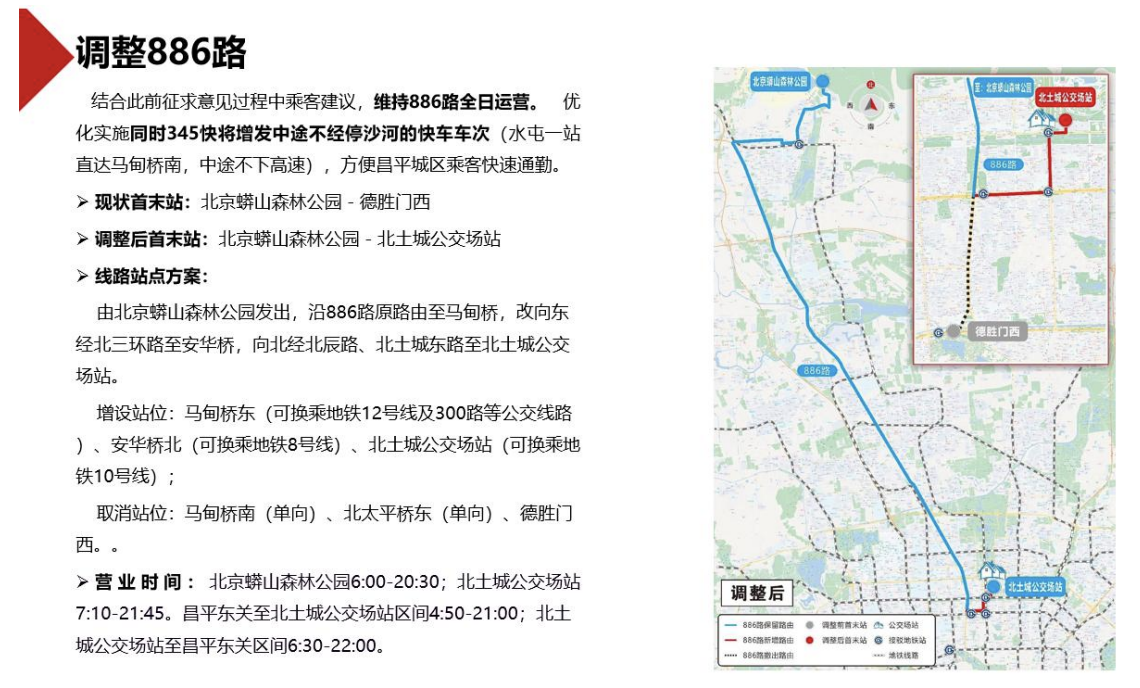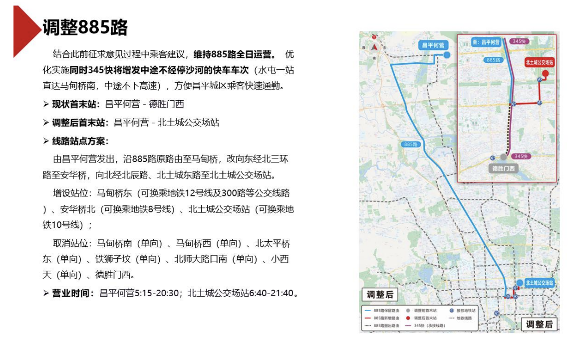 其中,调整885路、886路,由德胜门西调至北土城公交场站,强化昌平区市郊干线与三环路、市区地铁网的快速接驳,缓解德胜门外大街、北二环辅路交通压力。结合此前征求意见过程中乘客建议,维持885路、886路全日运营。优化后,885路、886路可在“马甸桥东”站与300路等三环路地面公交干线实现同台换乘,在“马甸桥东”站与地铁12号线、“安华桥北”站与地铁8号线、“北土城公交场站”与地铁10号线实现就近换乘。