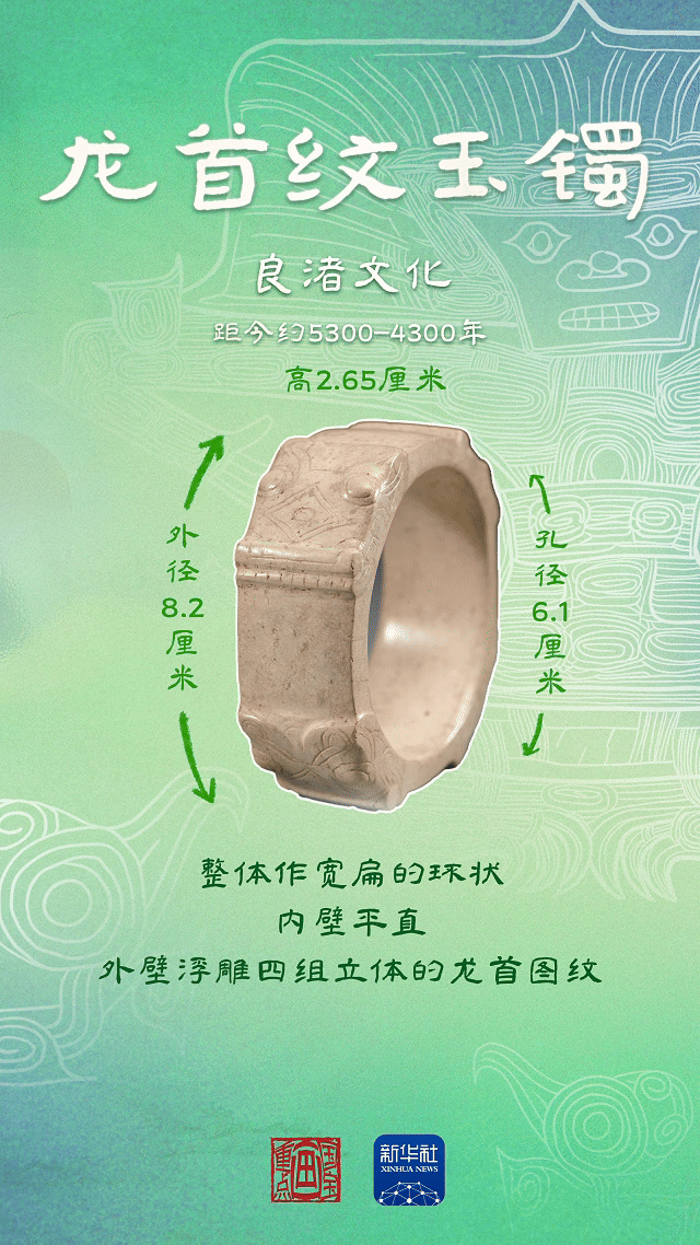 在良渚文化的早期,先民在雕琢玉器时,也曾刻绘过龙头的形象。这枚龙首纹玉镯出土于瑶山遗址中的一座女性墓地,体现了当时女性在部族中的较高地位。