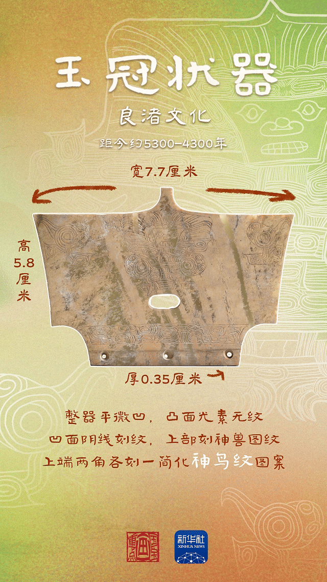 玉冠状器是一种有代表性的良渚玉器,它是戴在头上的玉插件,标识墓主人身份、等级和地位。它的基本形制取自“神人兽面纹”中神人头上的“介”字形冠帽。