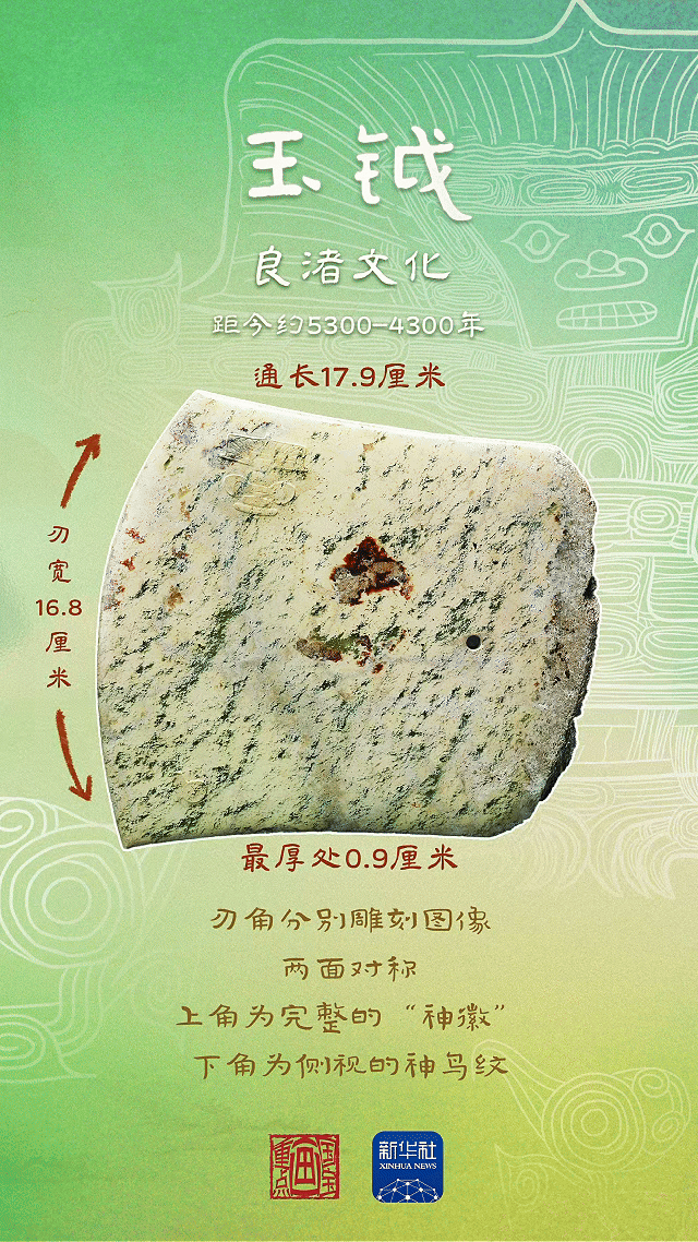 钺同样是良渚玉器中的重器,是象征男性权贵的随葬品,起源于斧钺。这件大玉钺和“玉琮王”一样,也出自反山12号墓地,它的两面都雕刻着“神人兽面纹”和“神鸟纹”。