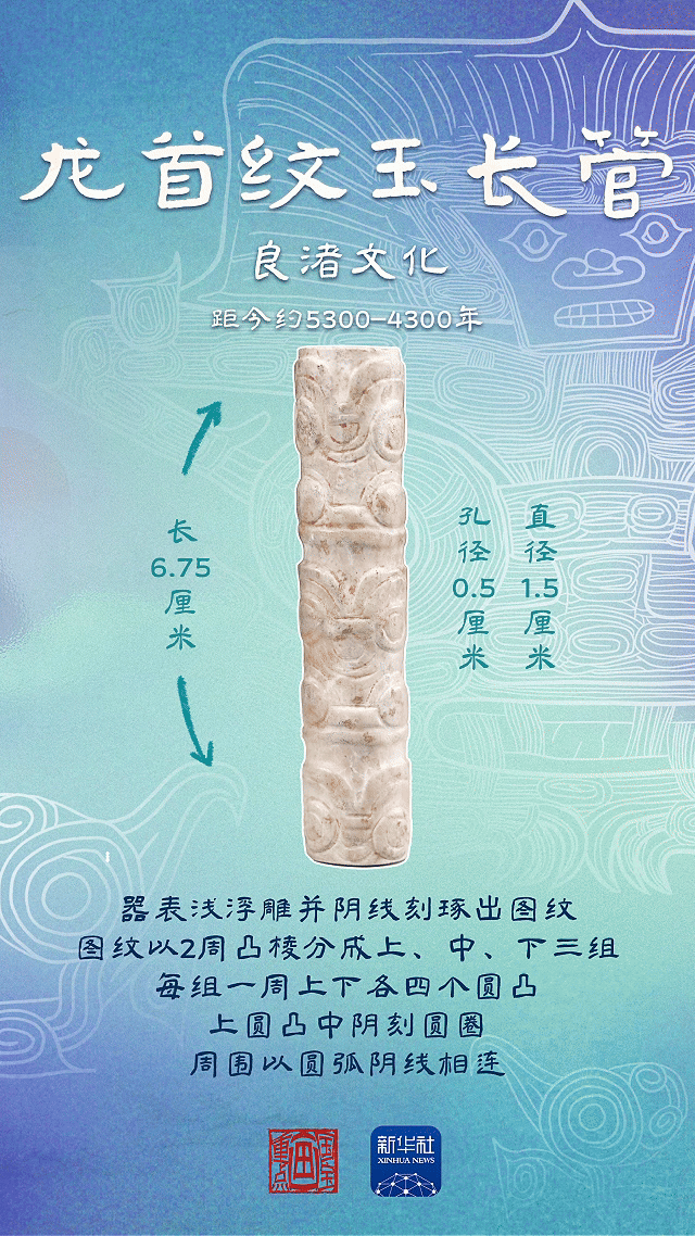 这件玉长管上同样雕琢了龙首纹。这种以环形玉器作为主要载体的表现方式,与红山文化的玉龙,商周青铜时代的龙形玉玦等极为相似,反映了文化的传承和融合。